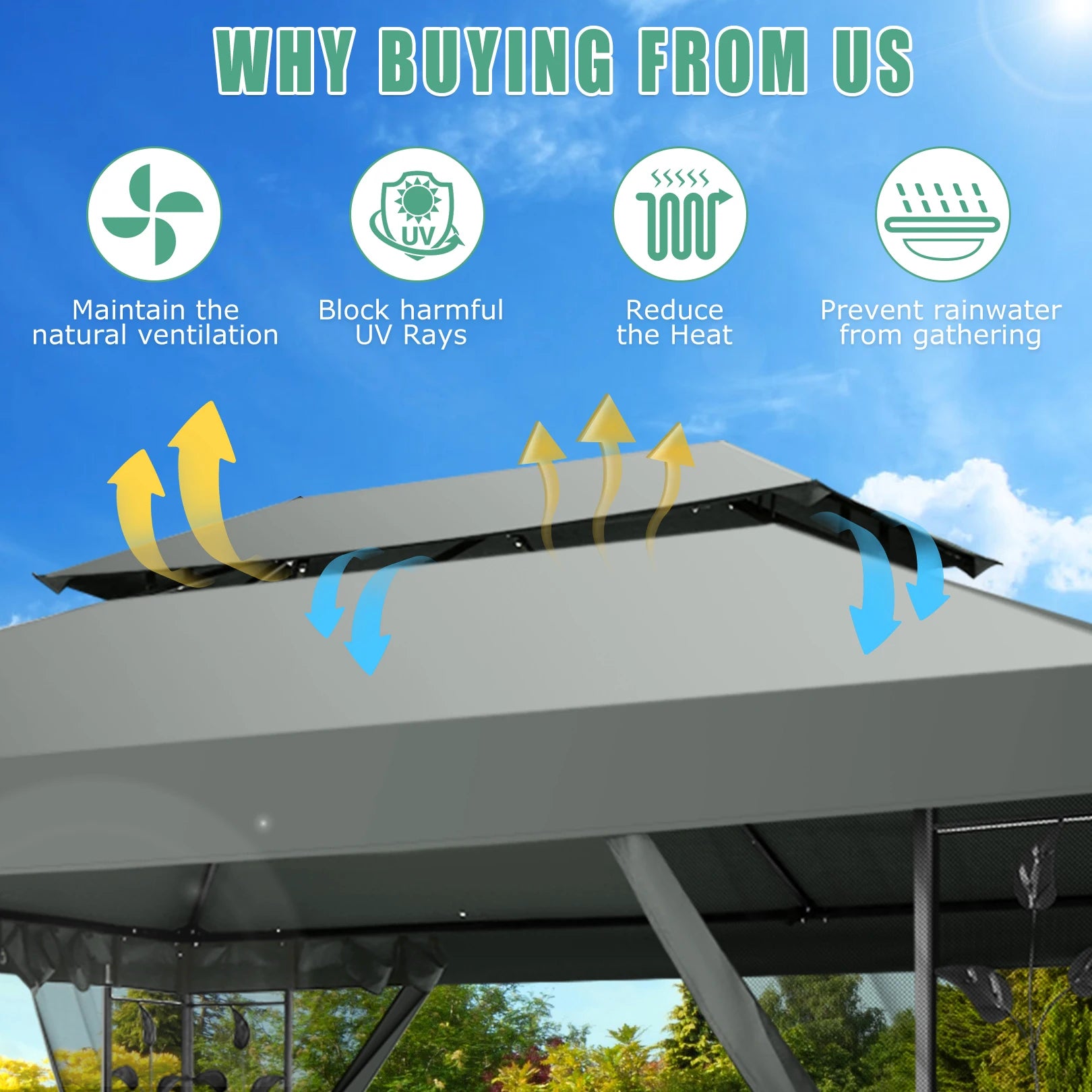 šćAdjustable & Ventilated Double Roof TopćThis HOTEEL 10x10 gazebo features an Oxford polyester top with PU coating, offering better protection from harmful UV rays, improved air circulation, and enhanced water resistance. This soft top gazebo includes drainage holes and adjustable plastic ends with 3 positions to tighten the canopy top and prevent water accumulation.