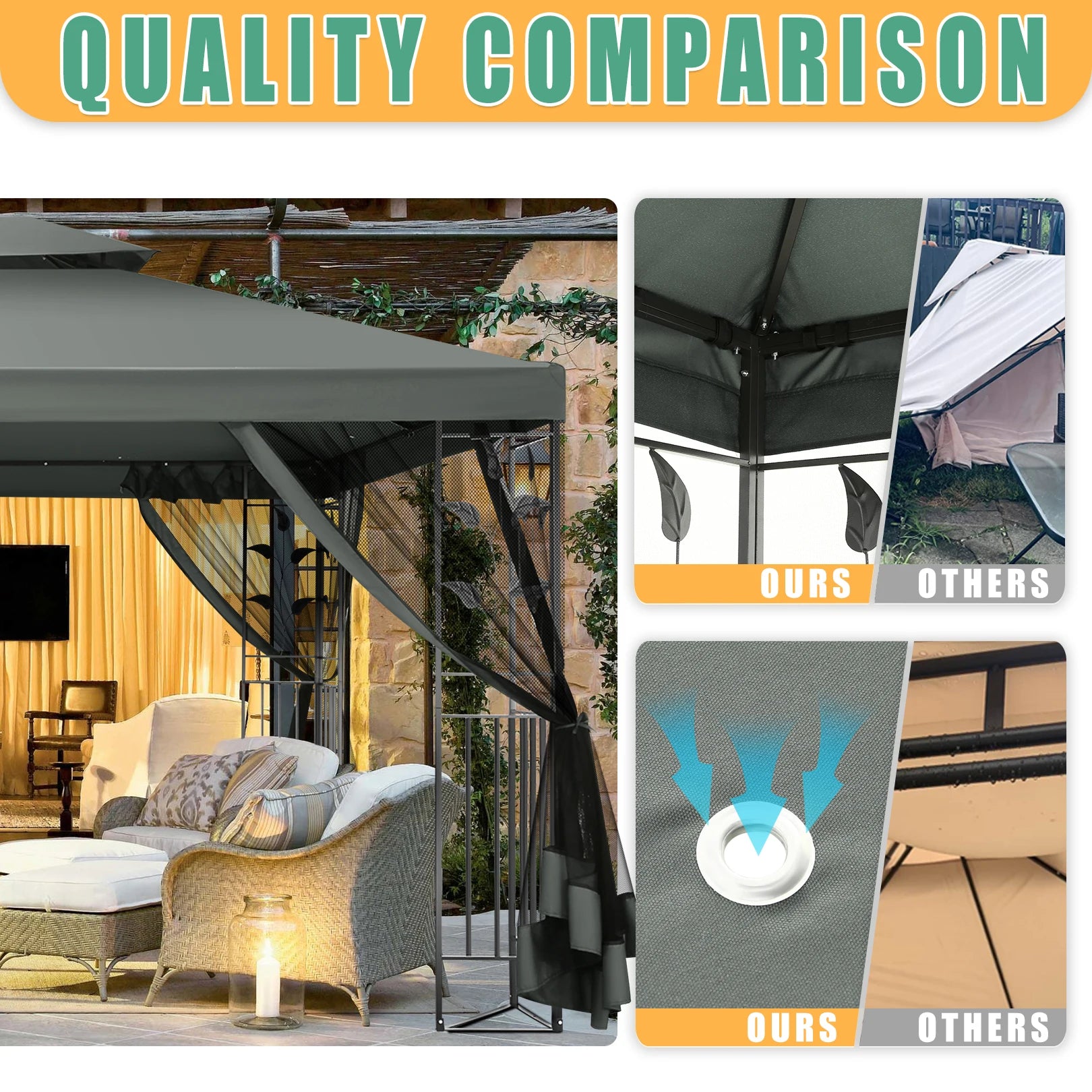 šćSmooth-Sliding & Bug-Free Netting with ZipperćThis gazebo tent is equipped with a mosquito netting screen that has two-sided zippers, allowing for proper ventilation while keeping pests out and enabling smooth sliding to open and close. And this garden gazebo comes with hook-and-loop fasteners, making it quick and easy to hang the screens.