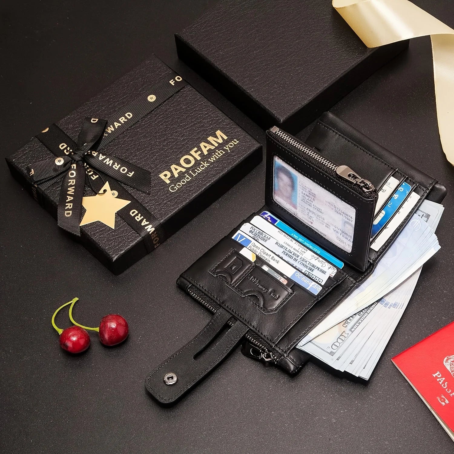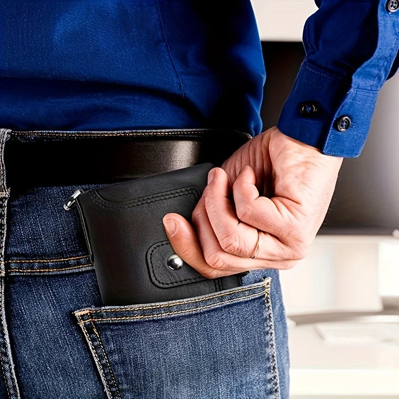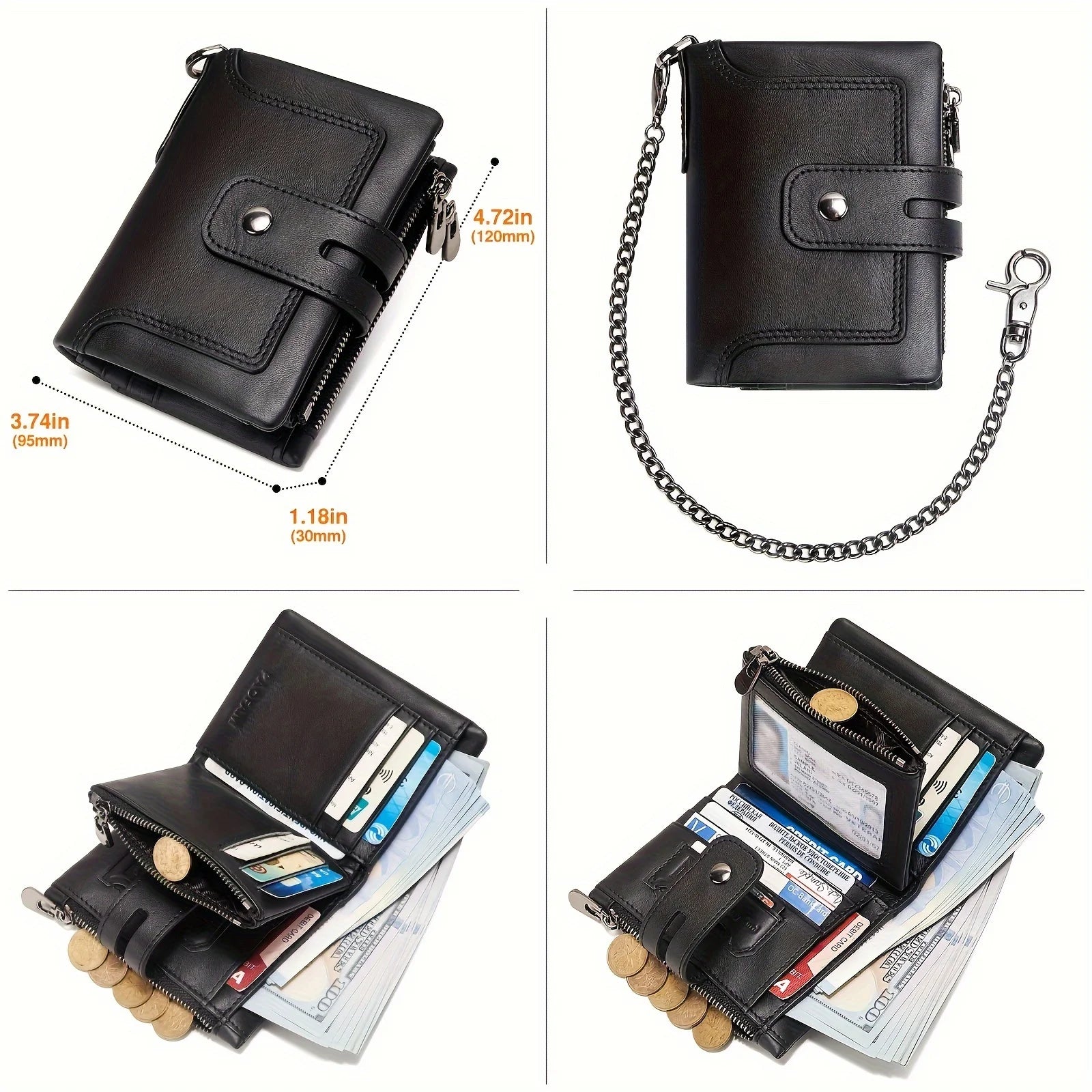 1pc Premium Top Layer Cowhide Leather Wallet - RFID Blocking, Bifold with Double Zipper Pockets & Anti-Theft Chain - Durable, St