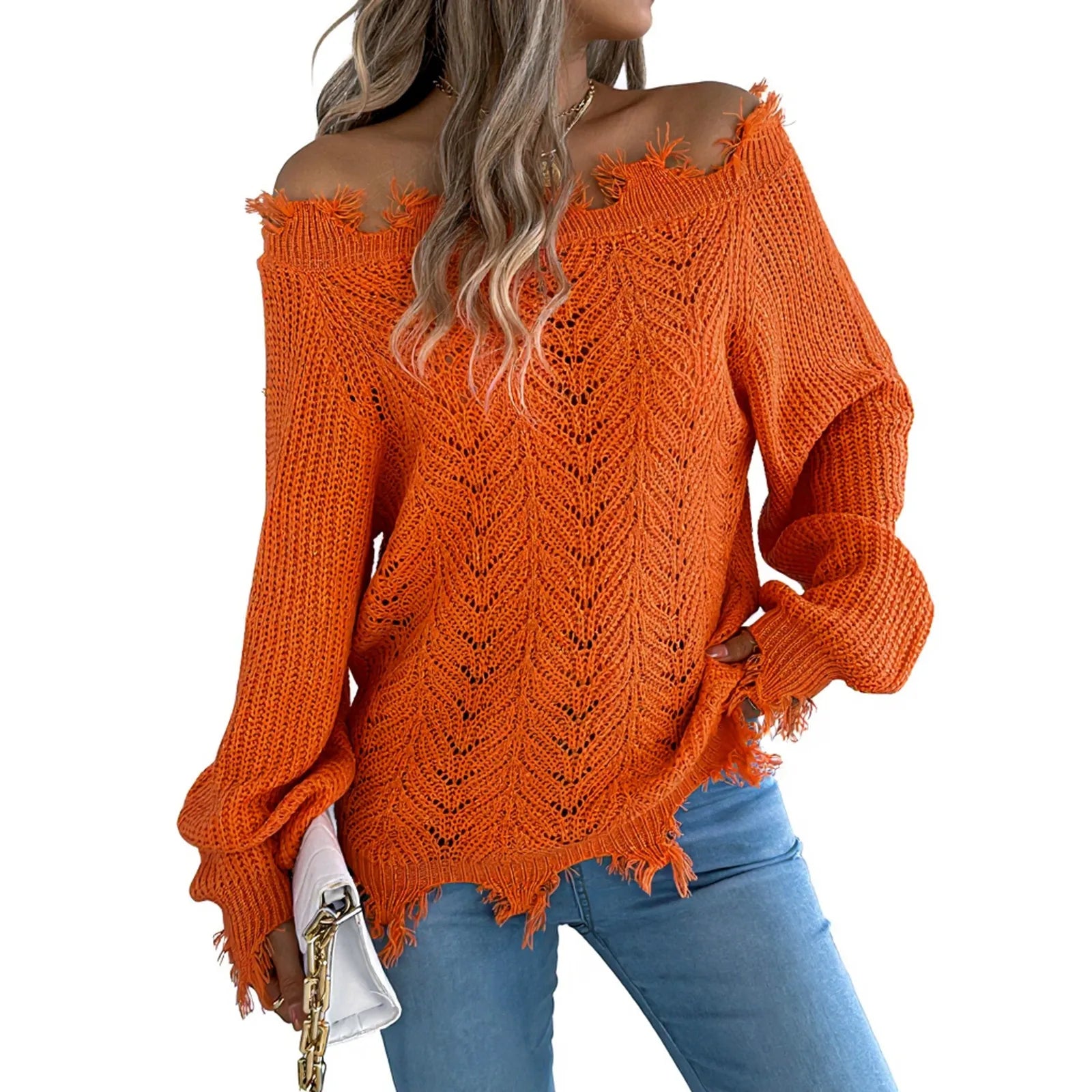 Women's Fashion Solid Color Hollow Long Sleeve Cut Off Shoulder Pullover Sweater
