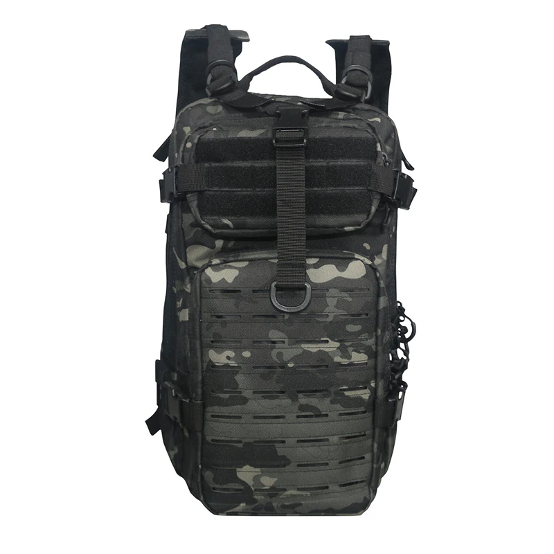 The Small Assault Pack is perfect for military, law enforcement and outdoor enthusiasts. The pack has four expanding compartrnents that provide up to 26 liters of storage. Internal dividers and zippered pockets are built in the three largest compartments. The mesh padced back panel can hold up to a 2.5 liter hydration bladder (bladder not included). The contoured shoulder straps are constructed with mesh padding and are also fully adjustable. The waist strap and sternum evenly distribute the weight load. Mclte system straps armor this bag with points for customizatk)n making it the perfect base for a functional bag. LASER CUT MOLLE WEBBING DESIGN