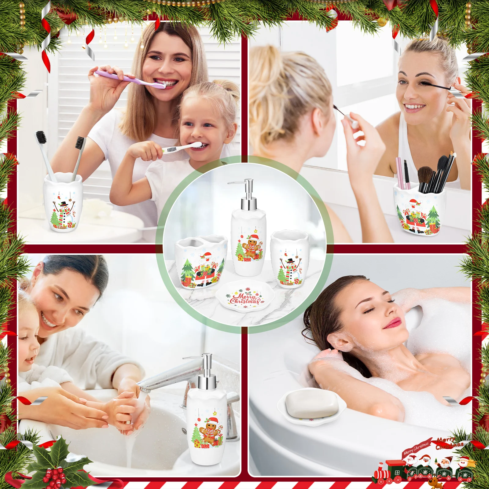 4-Piece Ceramic Christmas Bathroom Accessory W/ Tumbler/Toothbrush Holder/Soap Dish/Dispenser Christmas Toothbrush Holder Set