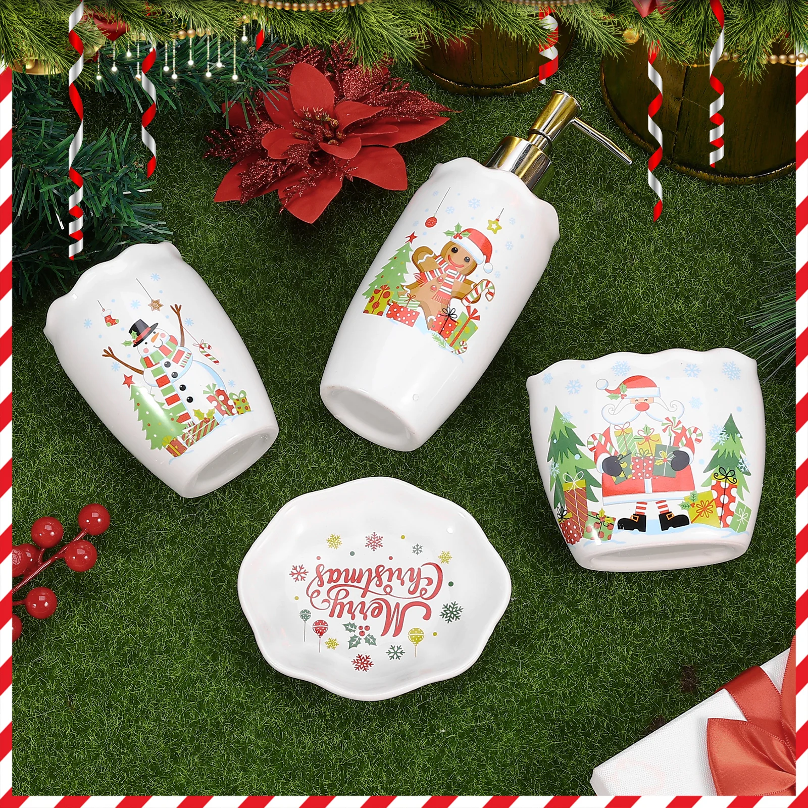 4-Piece Ceramic Beautiful Christmas Bathroom Decor Tumbler/Toothbrush Holder/1 Soap Dish/1 Dispenser Christmas Toothbrush Holder Set _x000D_