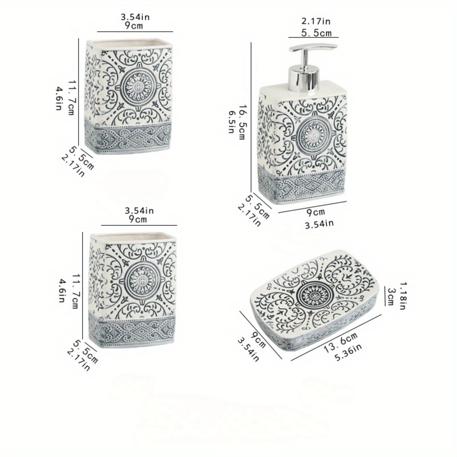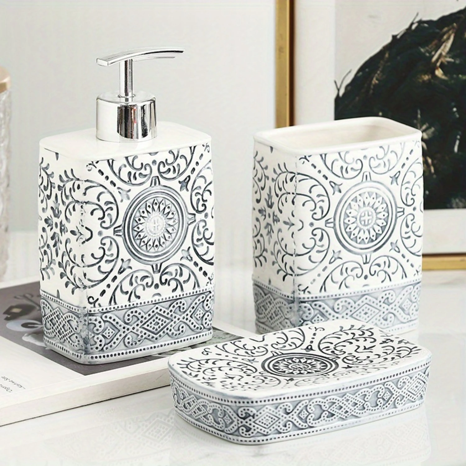 1. Elevate your bathroom decor with this 4-piece Bohemian Style Ceramic Bathroom Toiletry Set, featuring a soap dish, lotion bottle, mouthwash cup, and toothbrush holder.