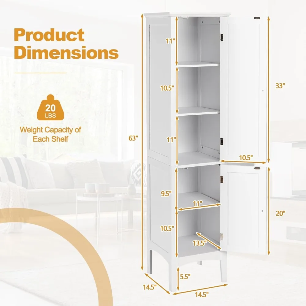 This bathroom cabinet offers ample storage with five-tiers and two enclosed cabinets, keeping your space tidy and organized. The cabinet doors protect contents from dust and maintain privacy, making it suitable for storing towels, books, plants, decorations, toiletries, and detergents on separate shelves. Made from thickened MDF panels with a smooth finish, the cabinet is designed for durability and has a strong load-bearing capacity of 20 lbs per shelf. The easy-to-clean surface makes maintenance simple. The cabinet features an anti-toppling design, ensuring safety by securing it to the wall with a device, and raised support legs that keep it stable and dry in humid bathroom conditions. Its slim and stylish design with a shutter-style door allows it to fit into limited spaces in various rooms such as the bathroom, kitchen, or living room, functioning as both a storage organizer and display shelf. Additional thoughtful details include a magnetic door catch for a tight closure, durable metal hinges for easy opening, and exquisite metal knobs for convenient access to the cabinet's contents.
