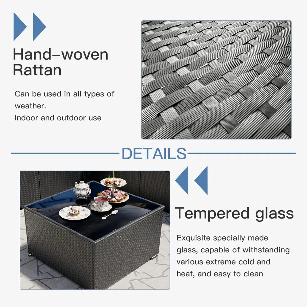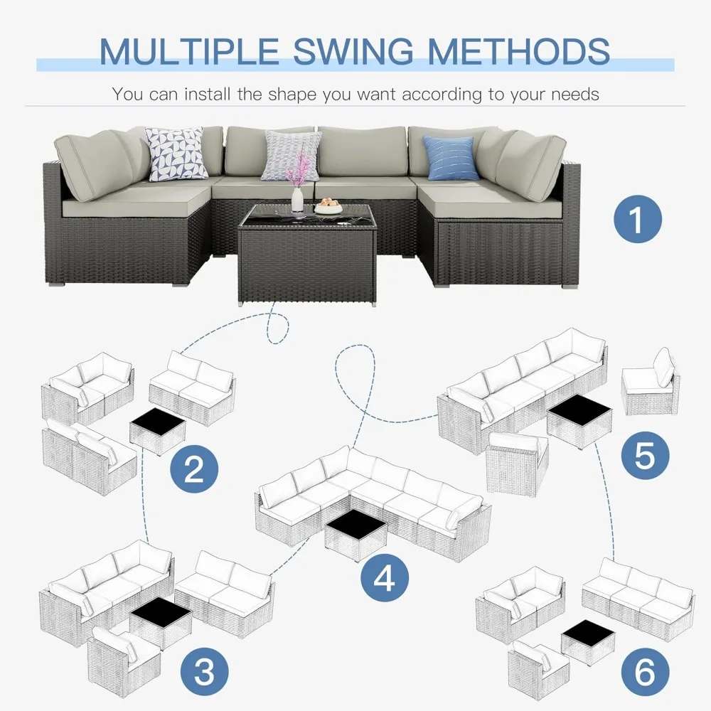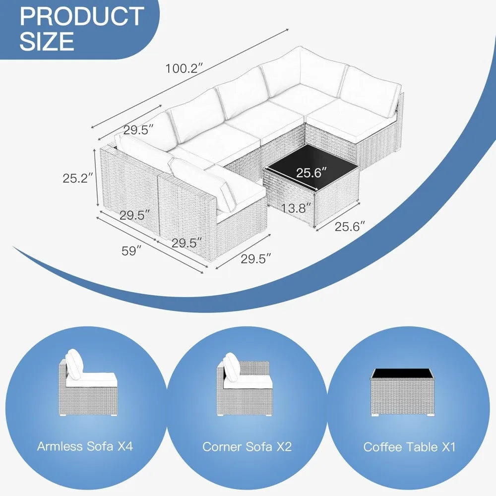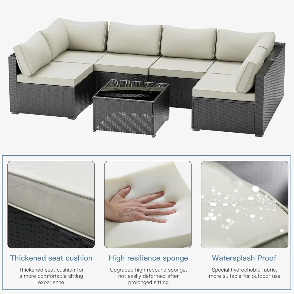 - OUTDOOR SOFA SET - The 7-piece outdoor sectional sofa features a sturdy steel frame that will never rust. Wicker is strong enough to withstand all weather changes. Thick waterproof durable cushions and tempered glass are easy to clean. Enjoy your great afternoon!