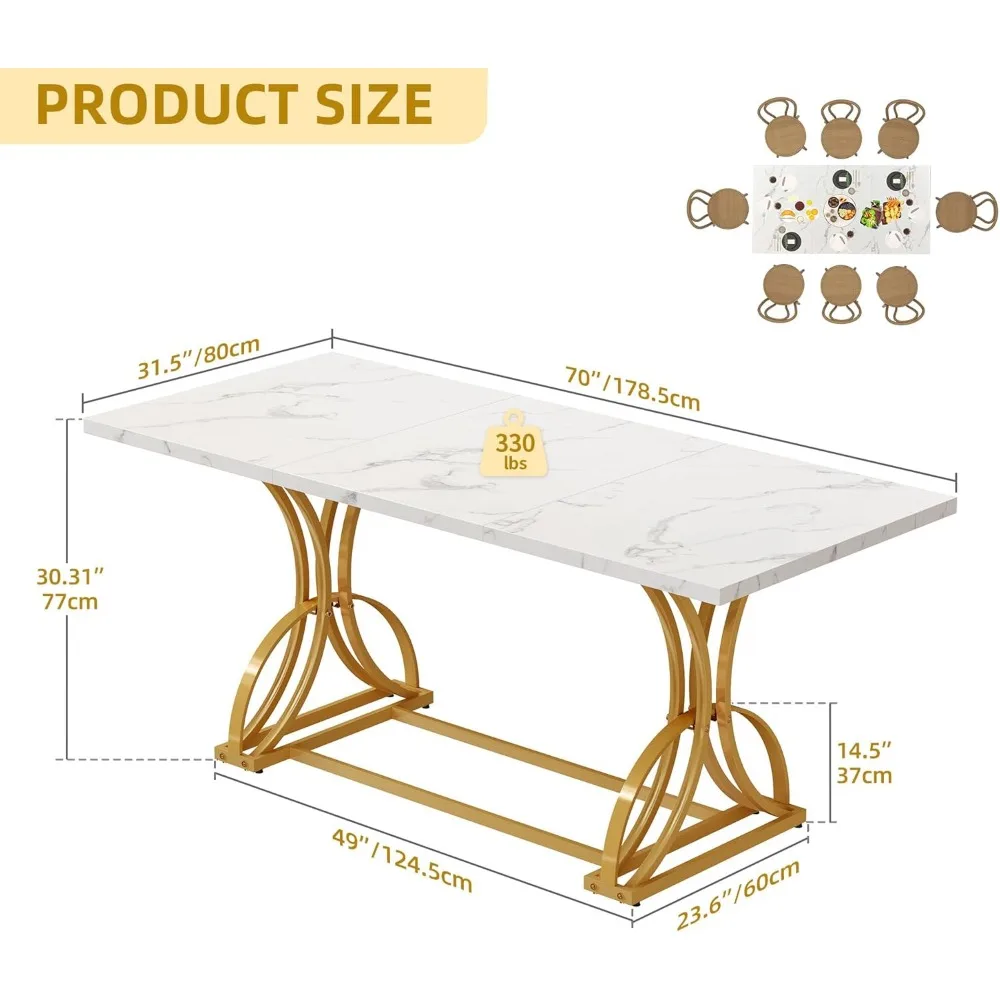 70.3" Large Modern Dining Table for 6-8 People Rectangular White Kitchen Dining Room Table with Faux Marble Tabletop