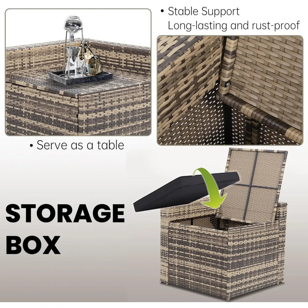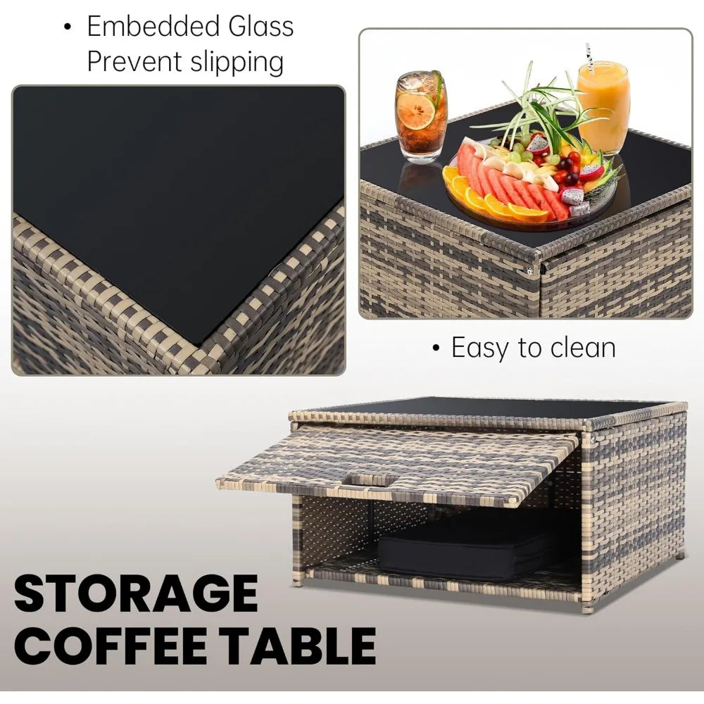 【8 PIECE SET WITH HIDDEN STORAGE】 Our outdoor patio furniture set includes seven (7) sectional sofas with plush cushions and a tempered glass top table with a hidden storage compartment.