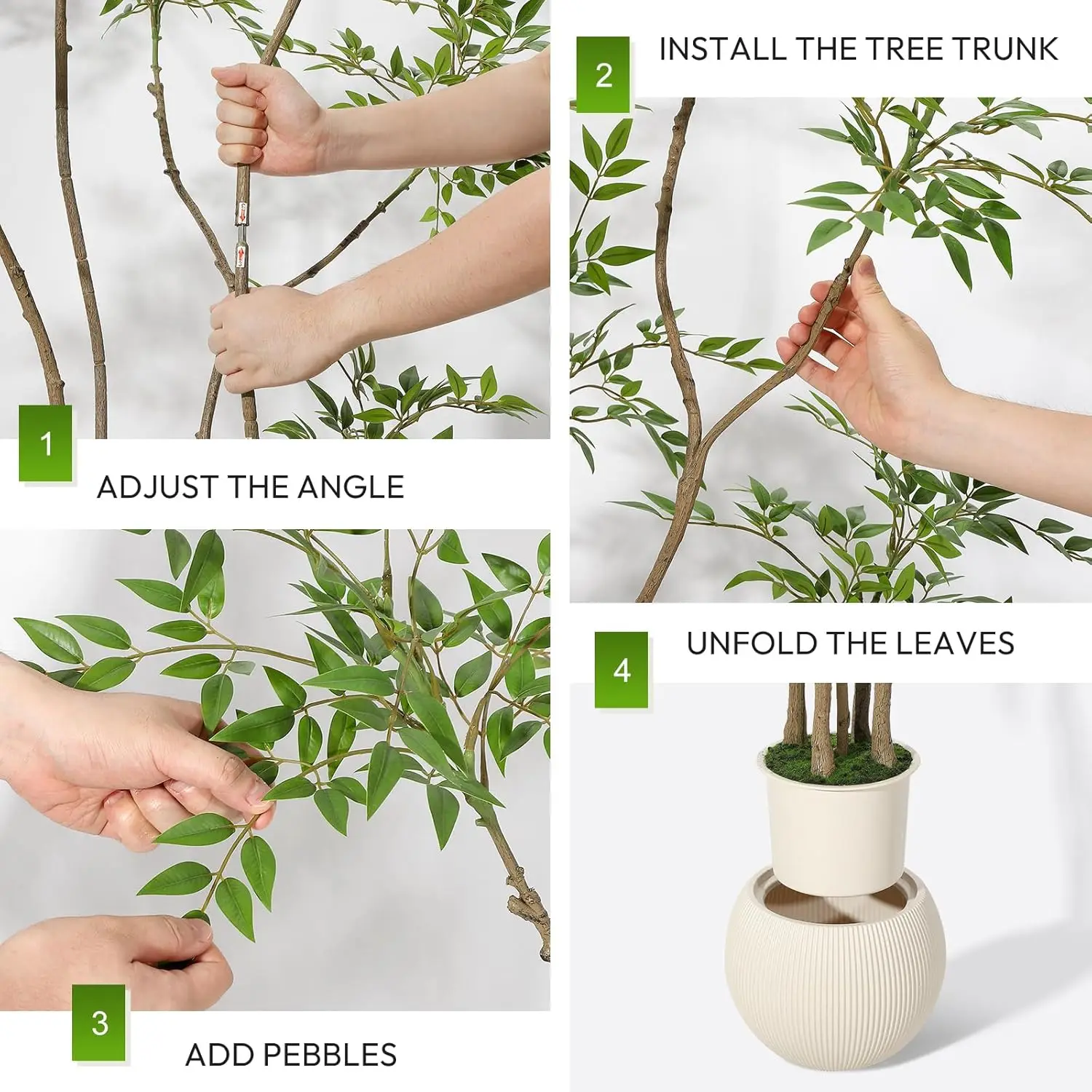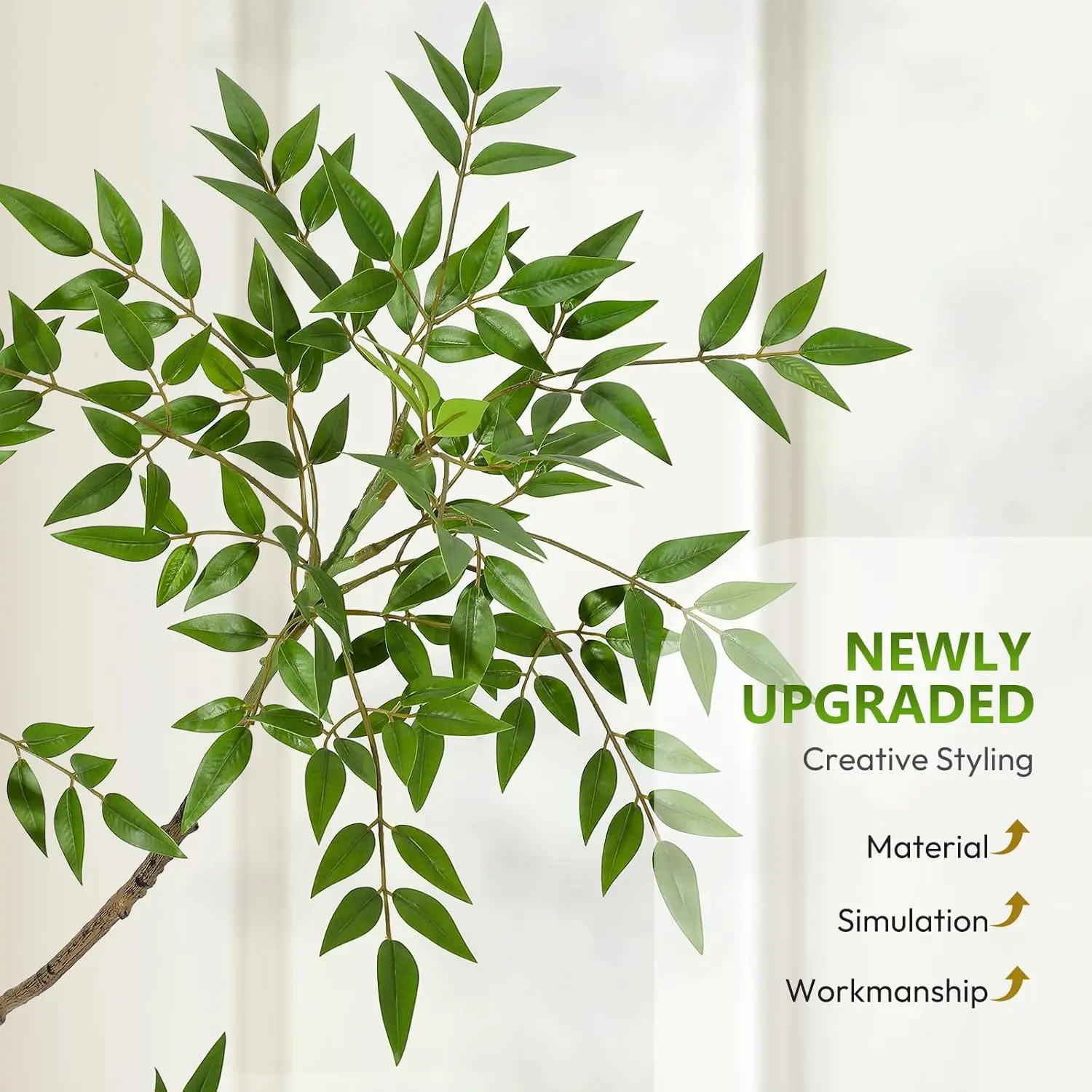 --- Easy Reshaping: Leaves may bend during transit; simply bend, separate, and fluff the foliage by hand to restore the artificial tree’s natural shape and fullness. Perfect for creating your own vibrant, tall indoor plant display with minimal effort.
