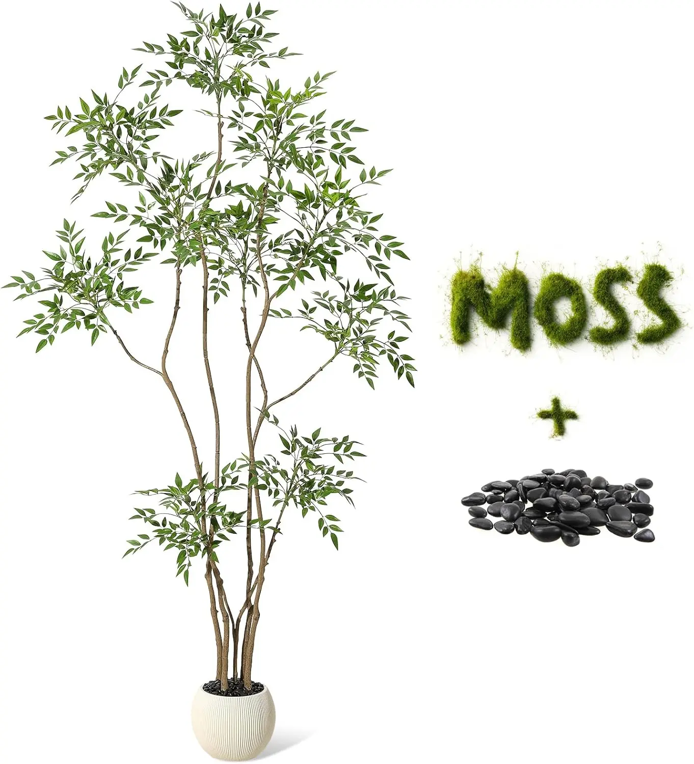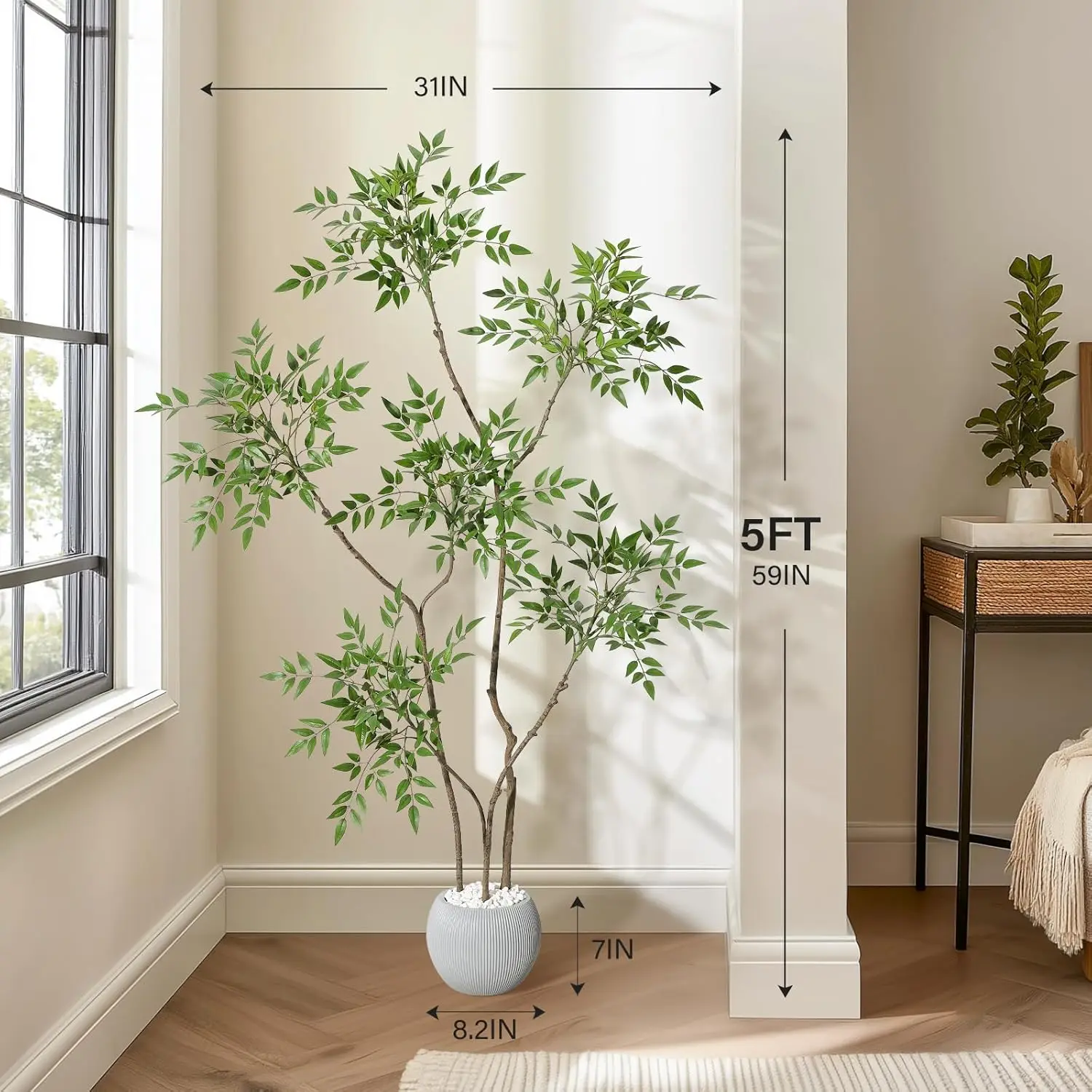 --- Exquisite Large Planter Included: This 150cm tall artificial tree comes with a stylish white imitation ceramic pot (21cm x 18cm) filled with durable clay and black pebbles, making it a perfect faux tree indoor décor piece for modern and minimalist homes.