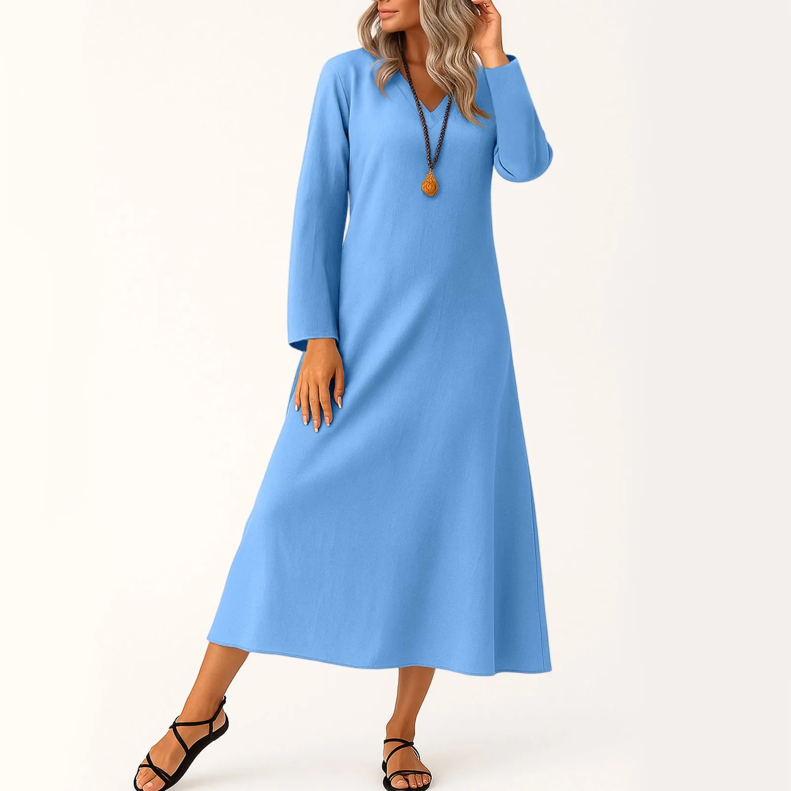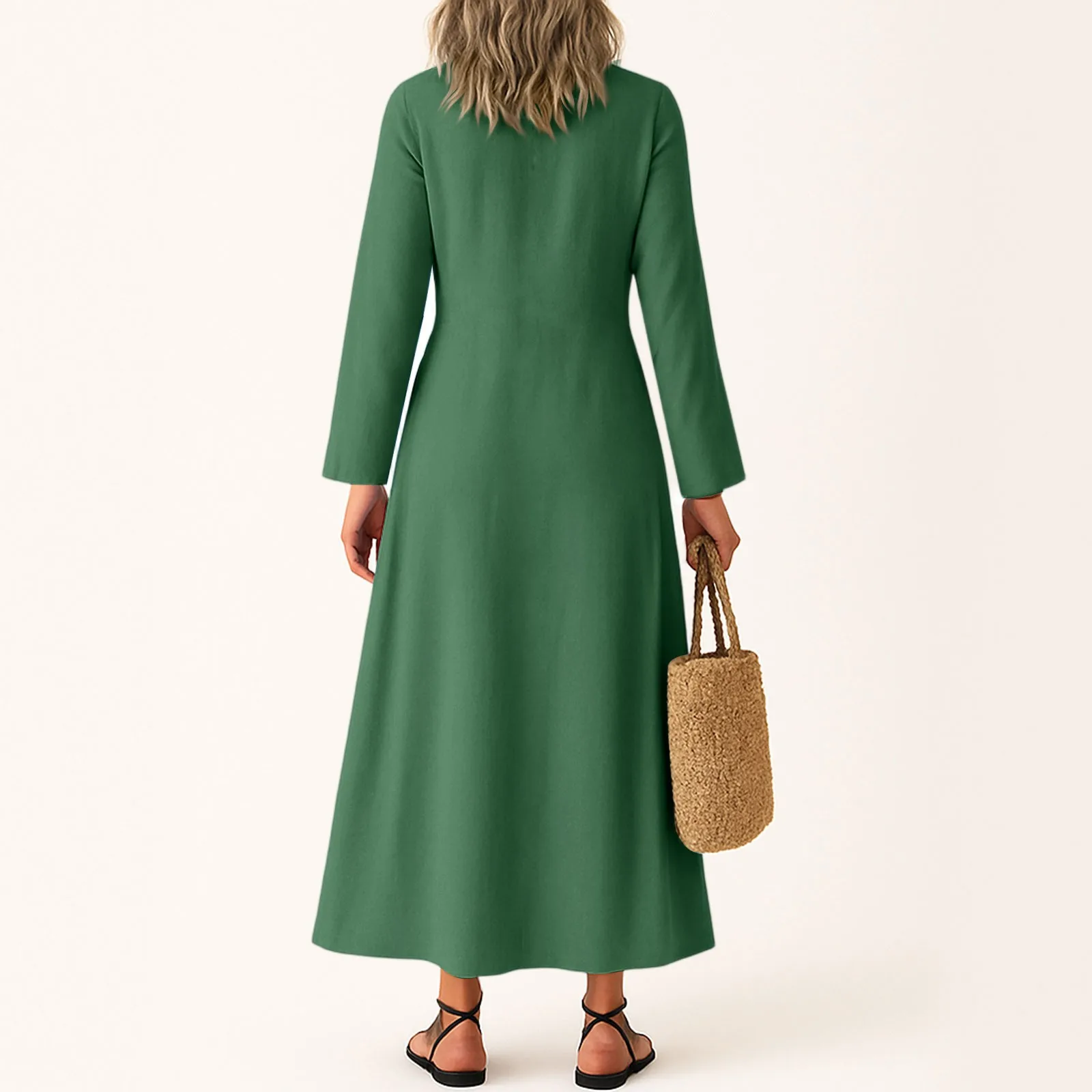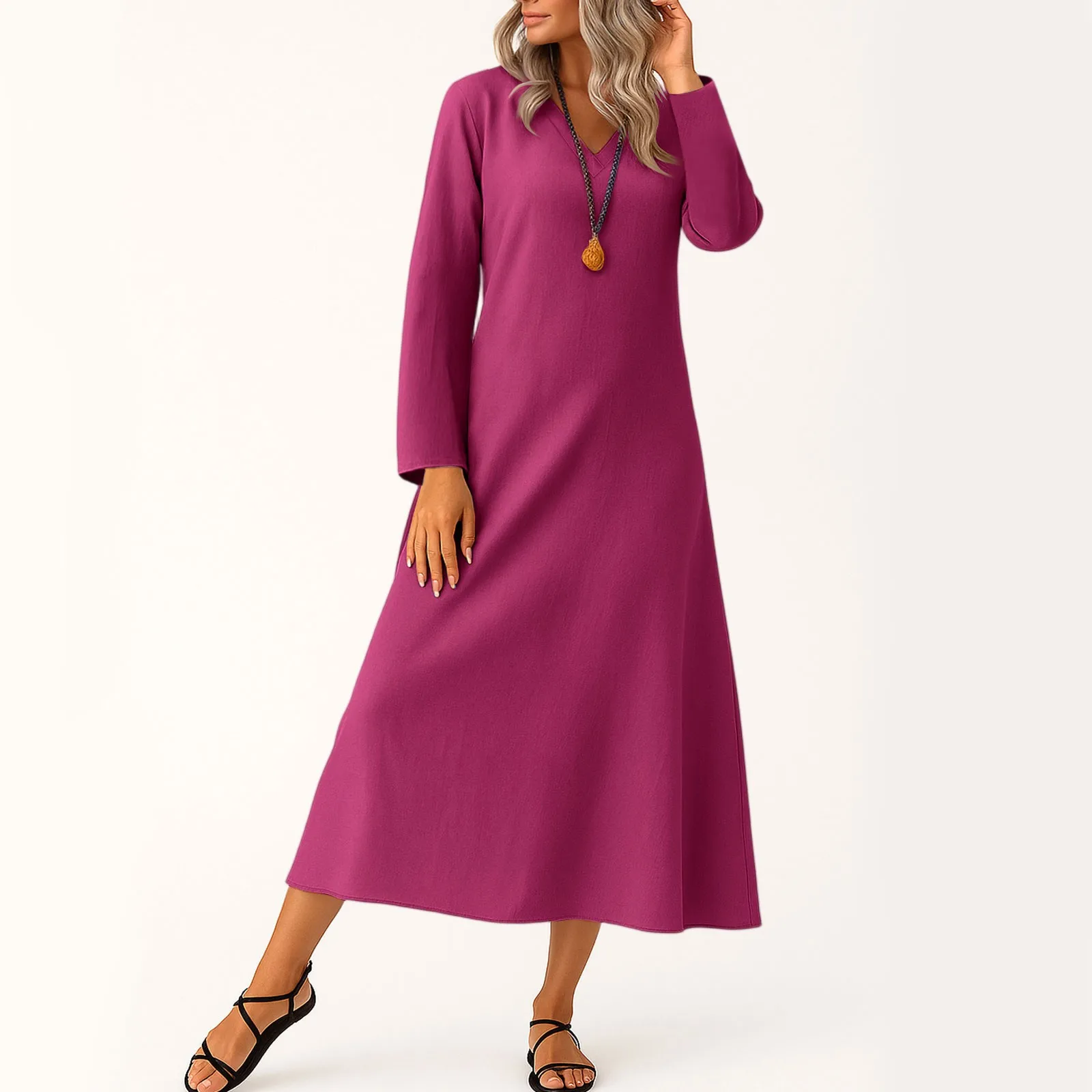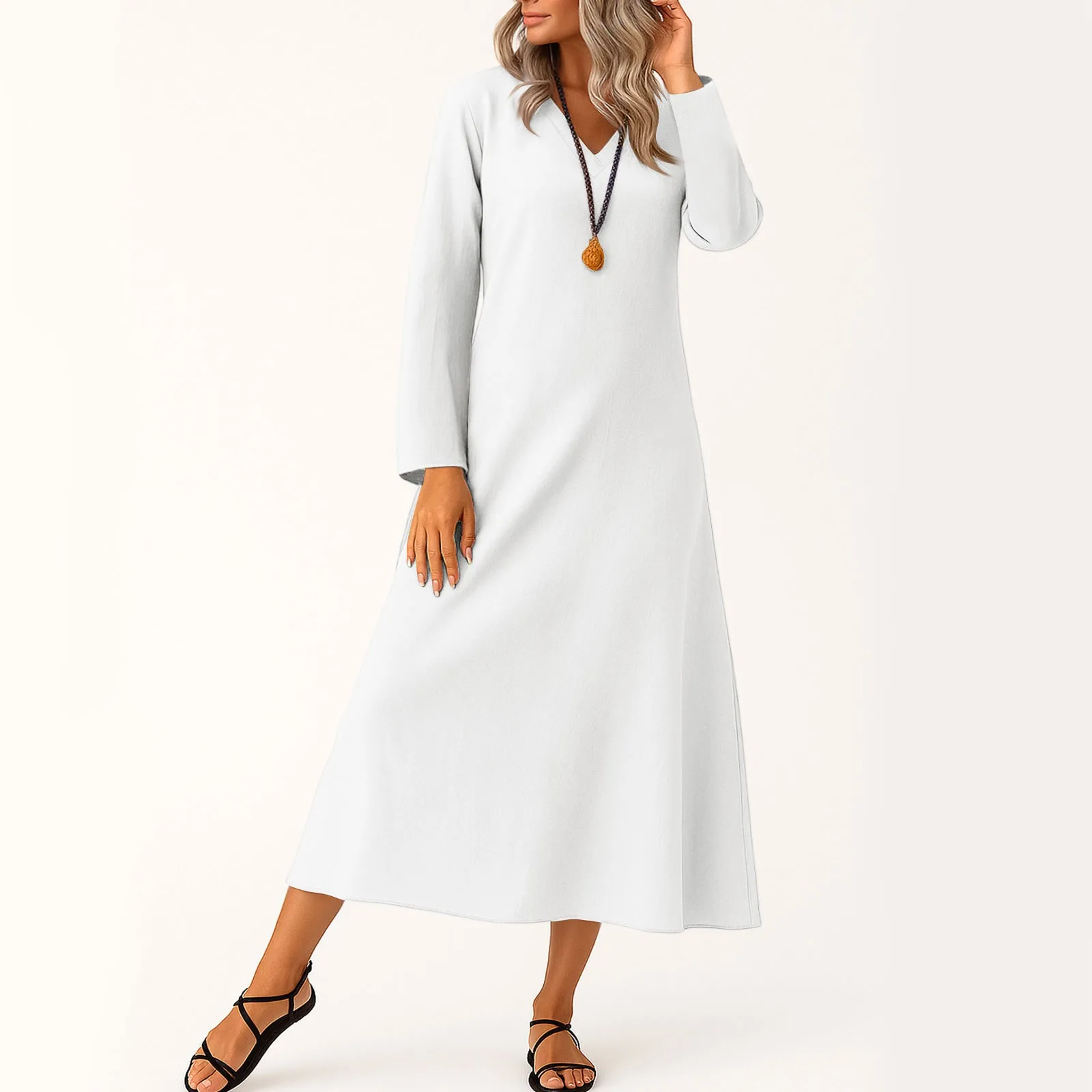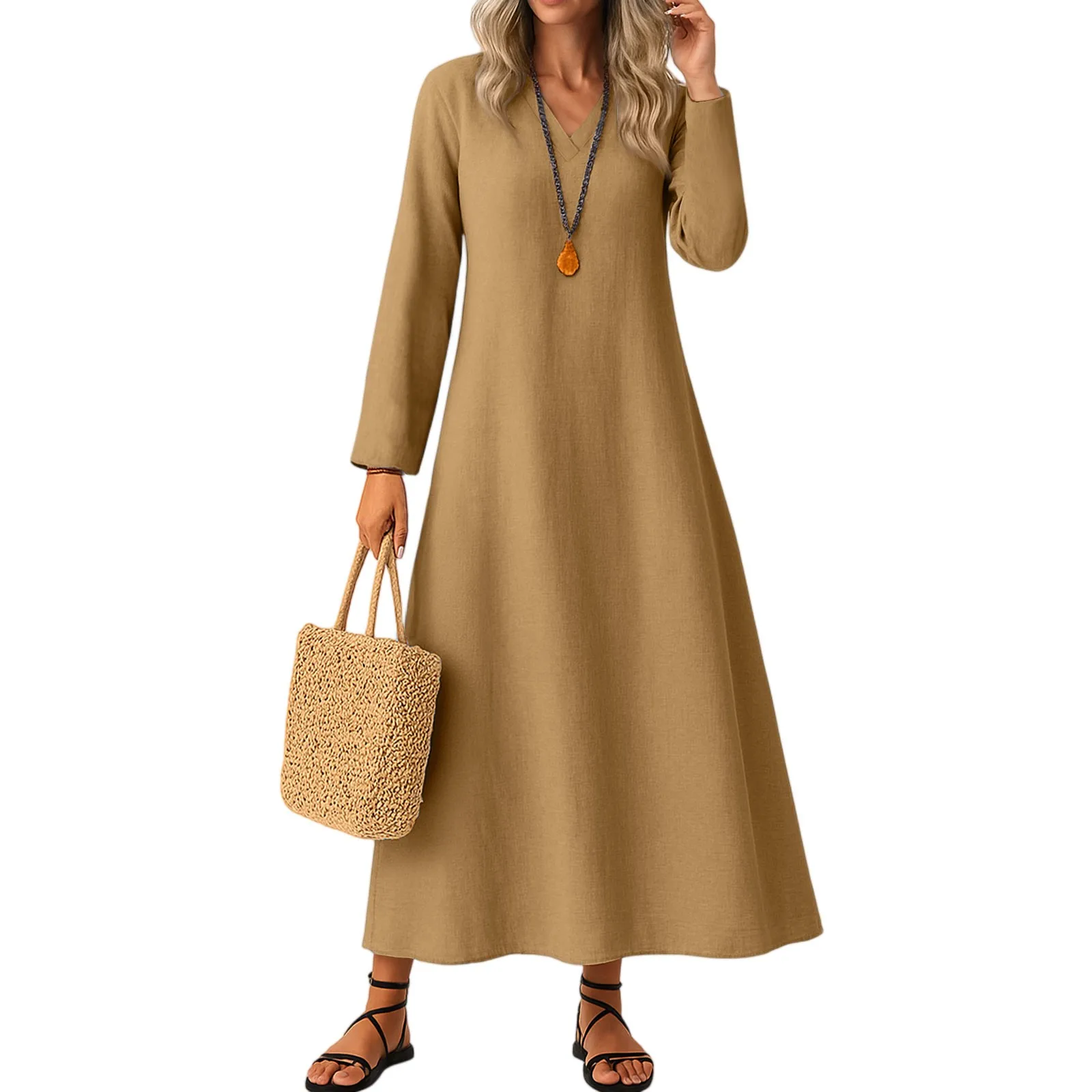 Dress For Women Long Boho Beach Dress Elegant Maxi Dress V-Neck Long Sleeve Dress With Pockets