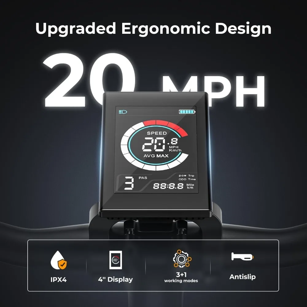 - 350 W Motor & Upgraded Display: The EB5 electric bike equipped with a 750 W peak motor, boosted a top speed of 20 MPH. The display panel has adjustable backlight brightness from 1-5 levels. In addition, the upgraded LCD Display provides riding data support, such as ODO/MAX/AVG SPEED, PAS mode can be customized up to 3 modes