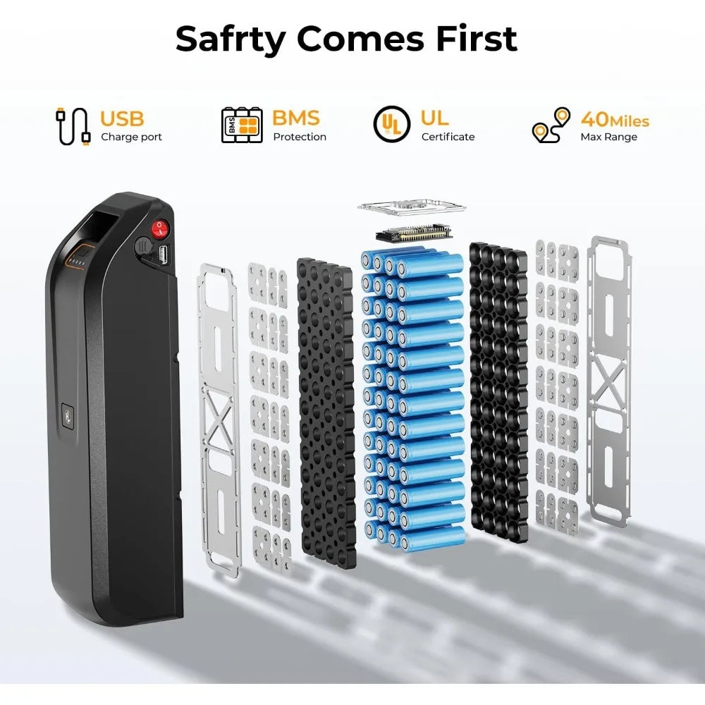 - Removable Large Battery: The EB5 e-bike is equipped with a 360 Wh battery, which covers a range of up to 25-40 miles per charge for 5-6 hours so that it can meet travel or daily commute needs. Removable battery makes charging more convenient whether you are at home or in the office