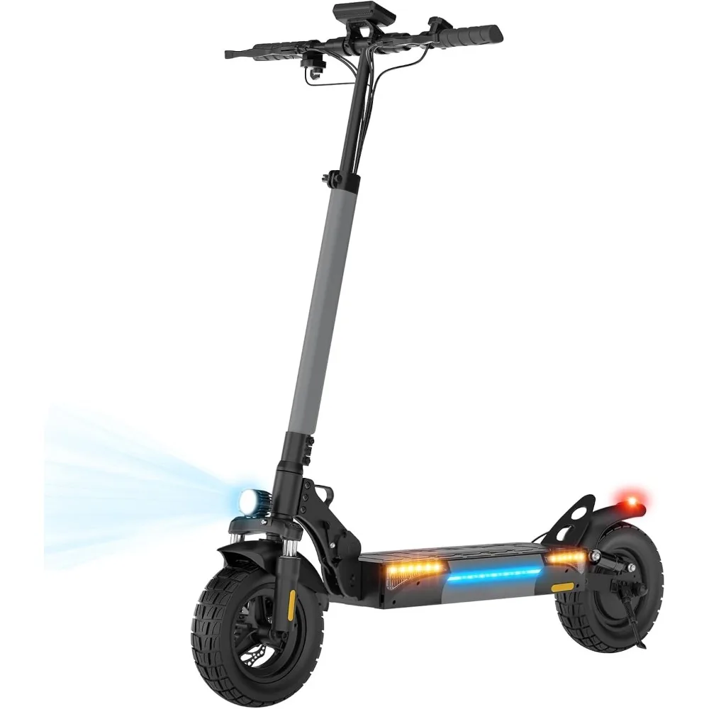- Advanced Safety & Visibility: Stay safe day or night with front/rear disc brakes, electronic braking, and UL2272 certification. Enhanced LED headlights, turn signals, pedal light, and taillights boost visibility, while the dual suspension system minimizes bumps for a stable ride, even on rough terrain. The scooter waterproof rating of IPX4.