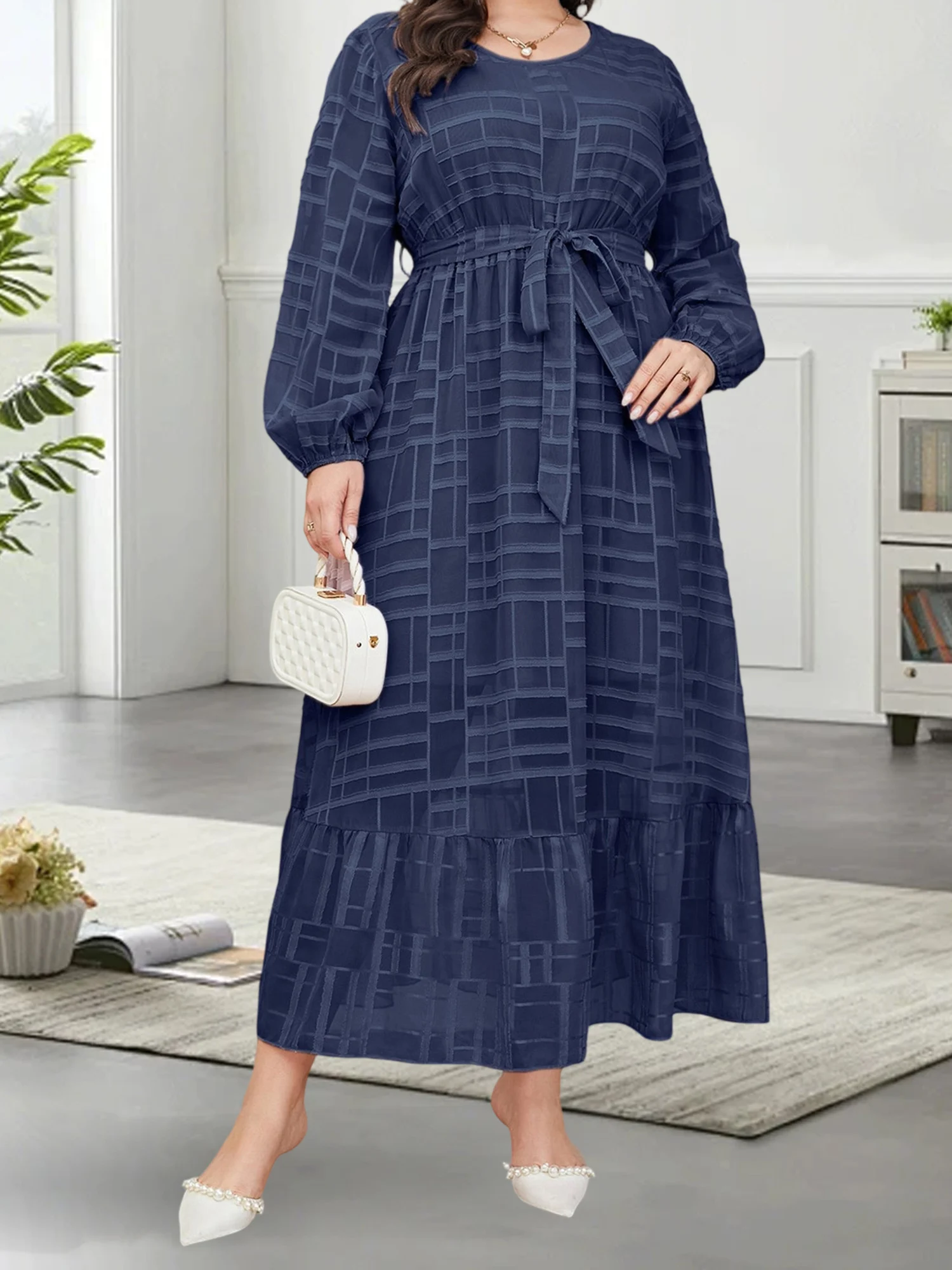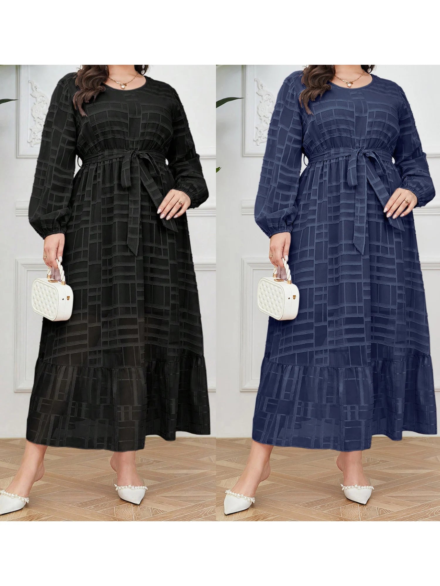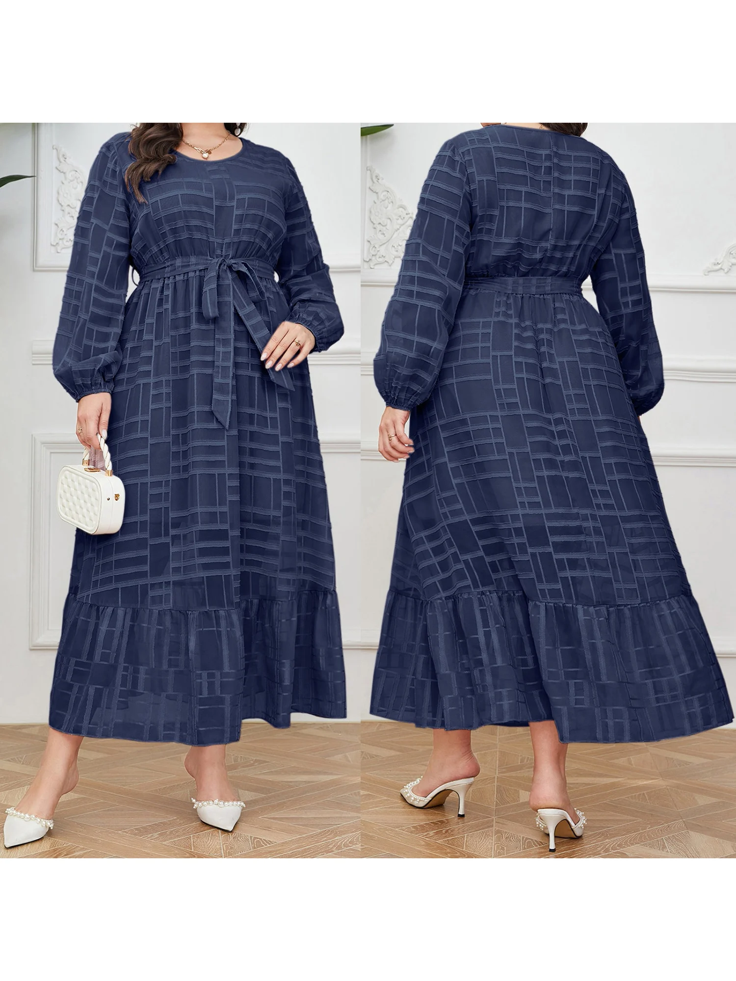 Women's Plus Size Long Dress Fashion Print Round Neck Long Sleeve A-Line Dress with Belt for Daily Party TravelSize (cm)