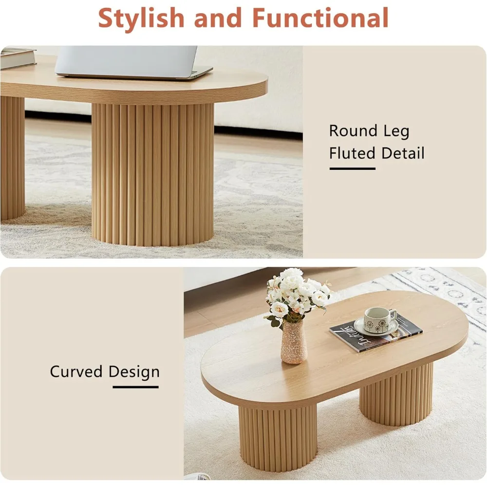Fluted Oval Coffee Table for Living Room, Boho Modern Coffee Table with Fluted Legs, Curved Round Wood Center Table for Home, S