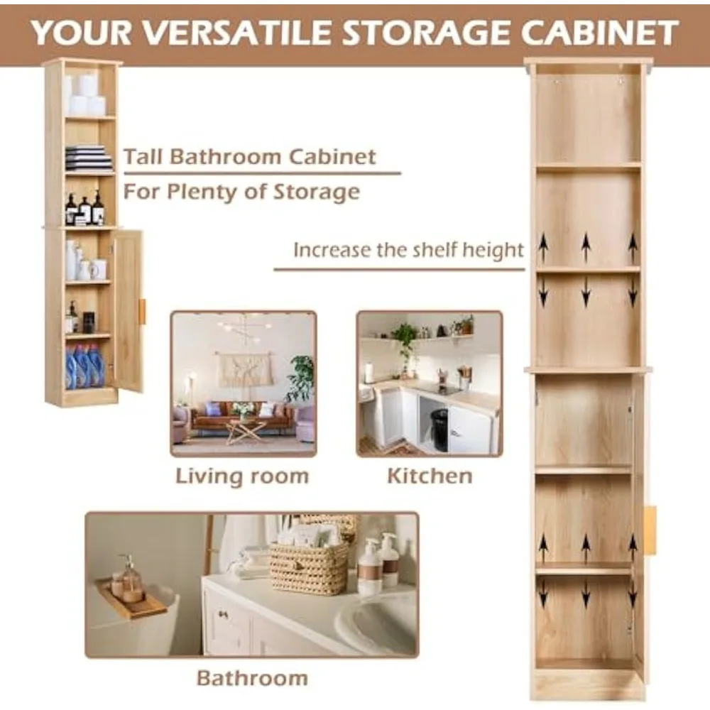 Freestanding Wooden Bathroom Storage Cabinet with Door and 6 Adjustable Shelves, Slim Design for Linen Organization