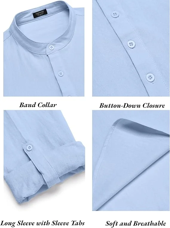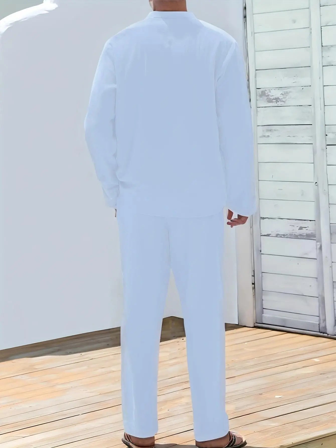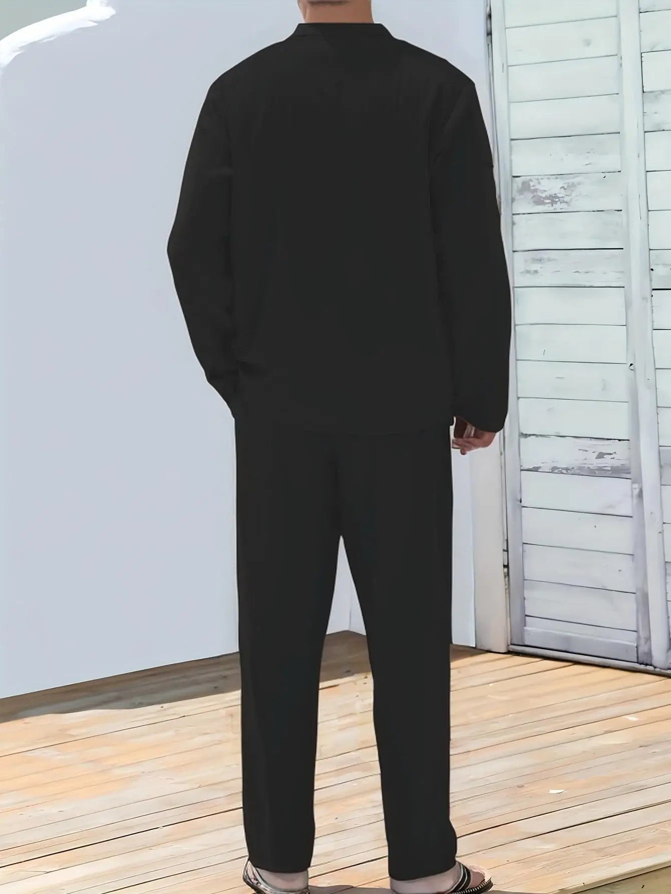 Men's 2 Pieces Cotton Linen Set Long Sleeve Henley Shirts Casual Beach Pants With Pockets
