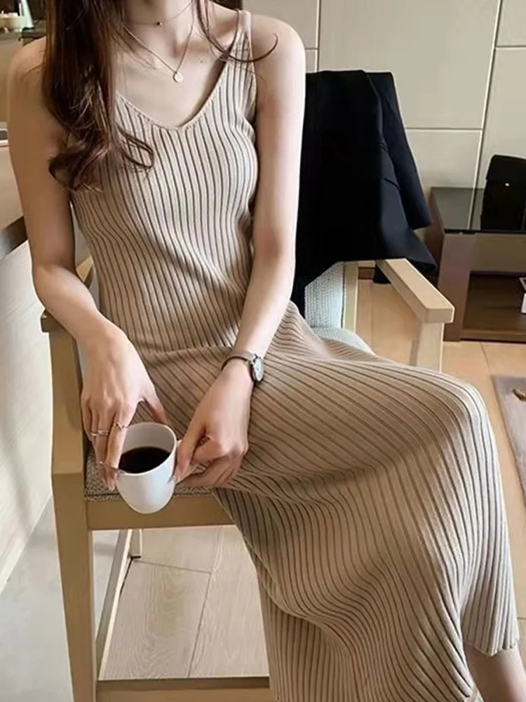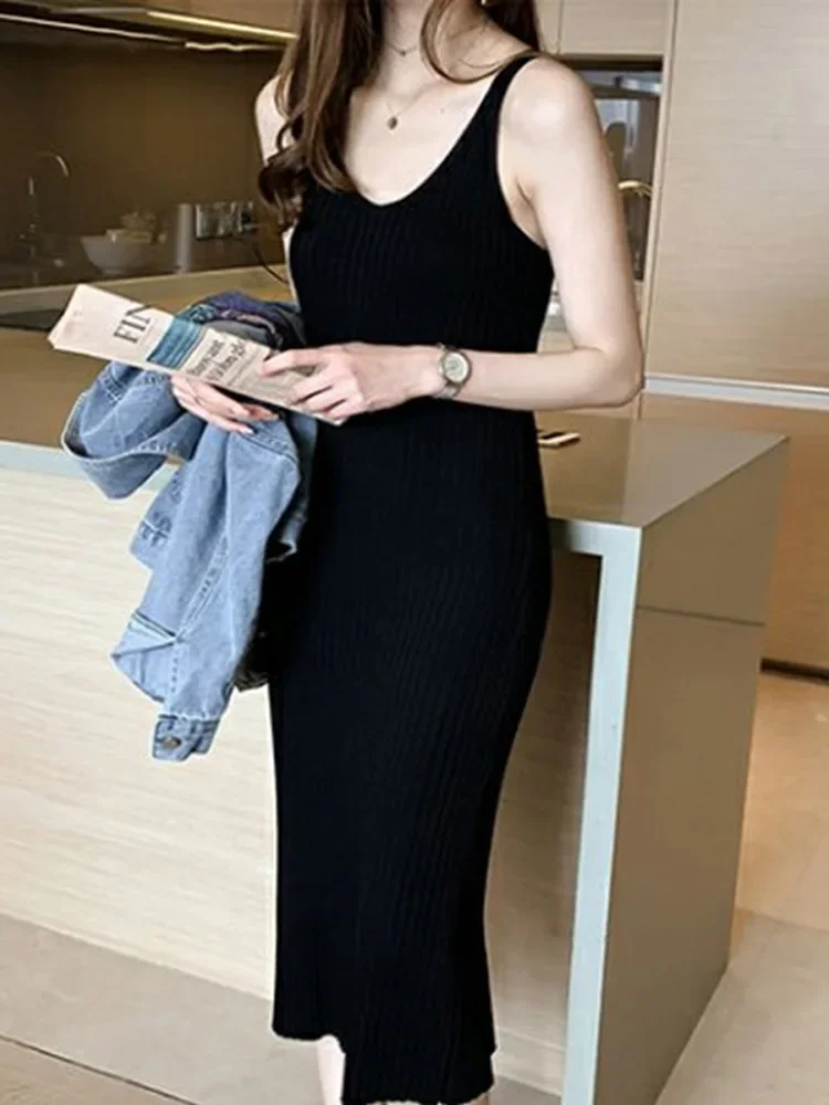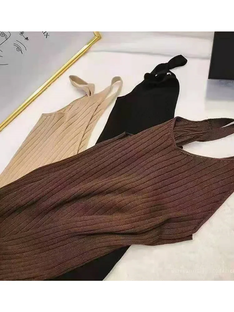 New Fashion Sleeveless Lady Elegant Office Knit Clothes Sexy Slip Dress for Women Autumn Spring Knitted Bottoming Long Dresses