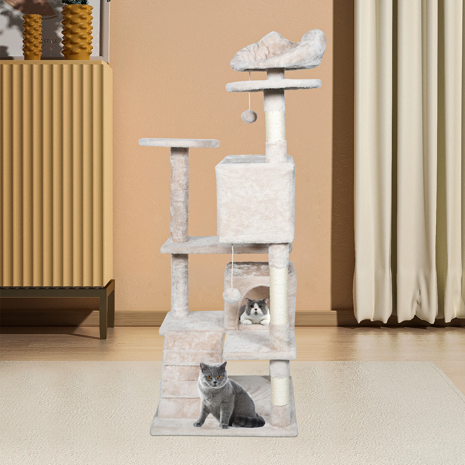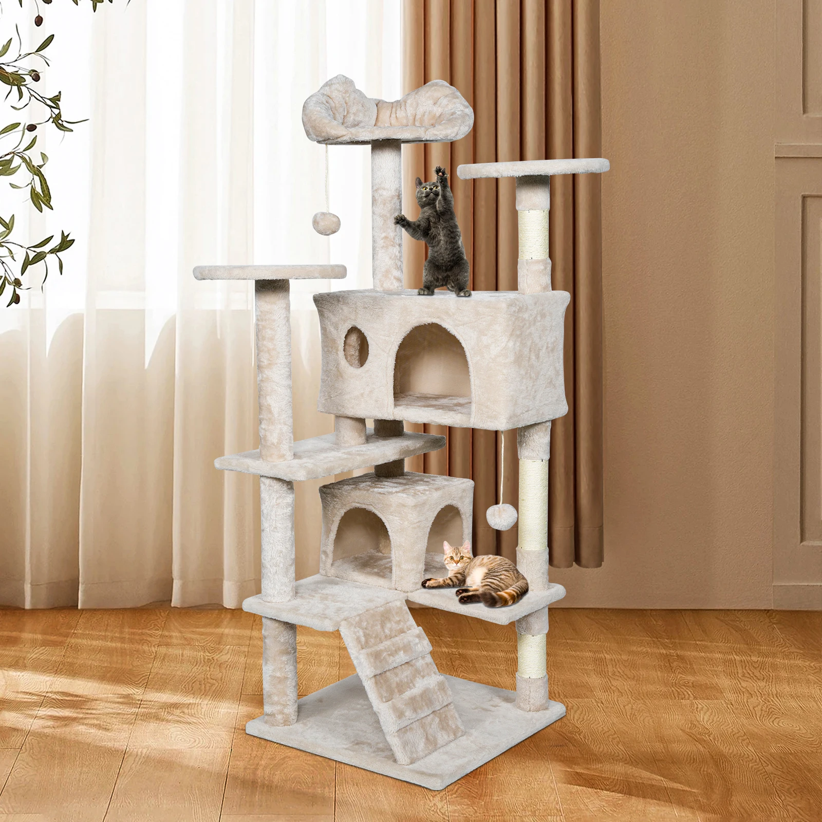 4. All-in-one relaxation spot: The spacious litter, soft surface and multiple perches provide a luxurious napping experience for cats; the specially added hanging balls adds more fun to their playtime.