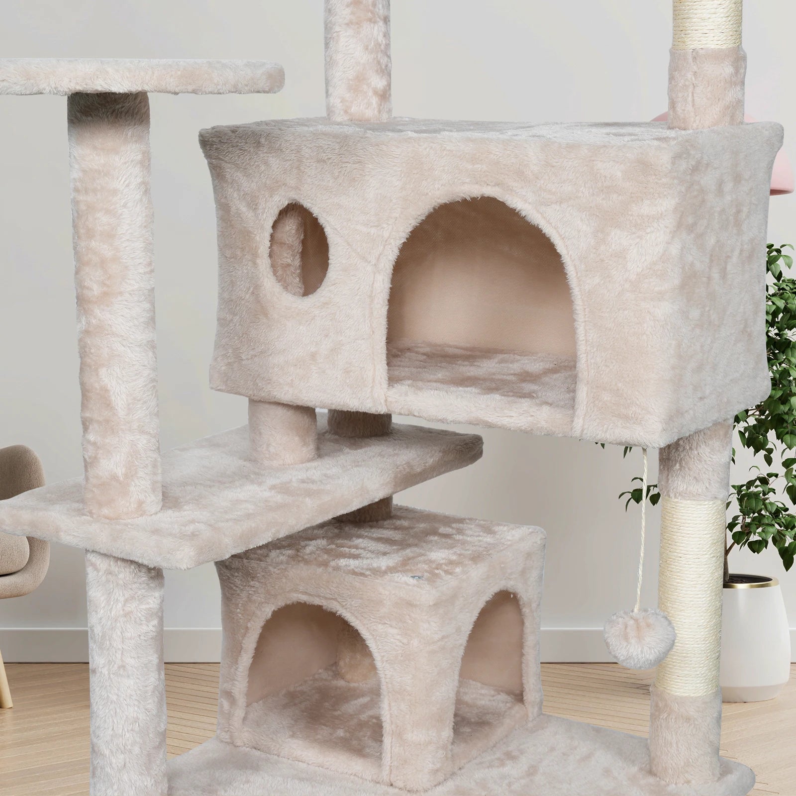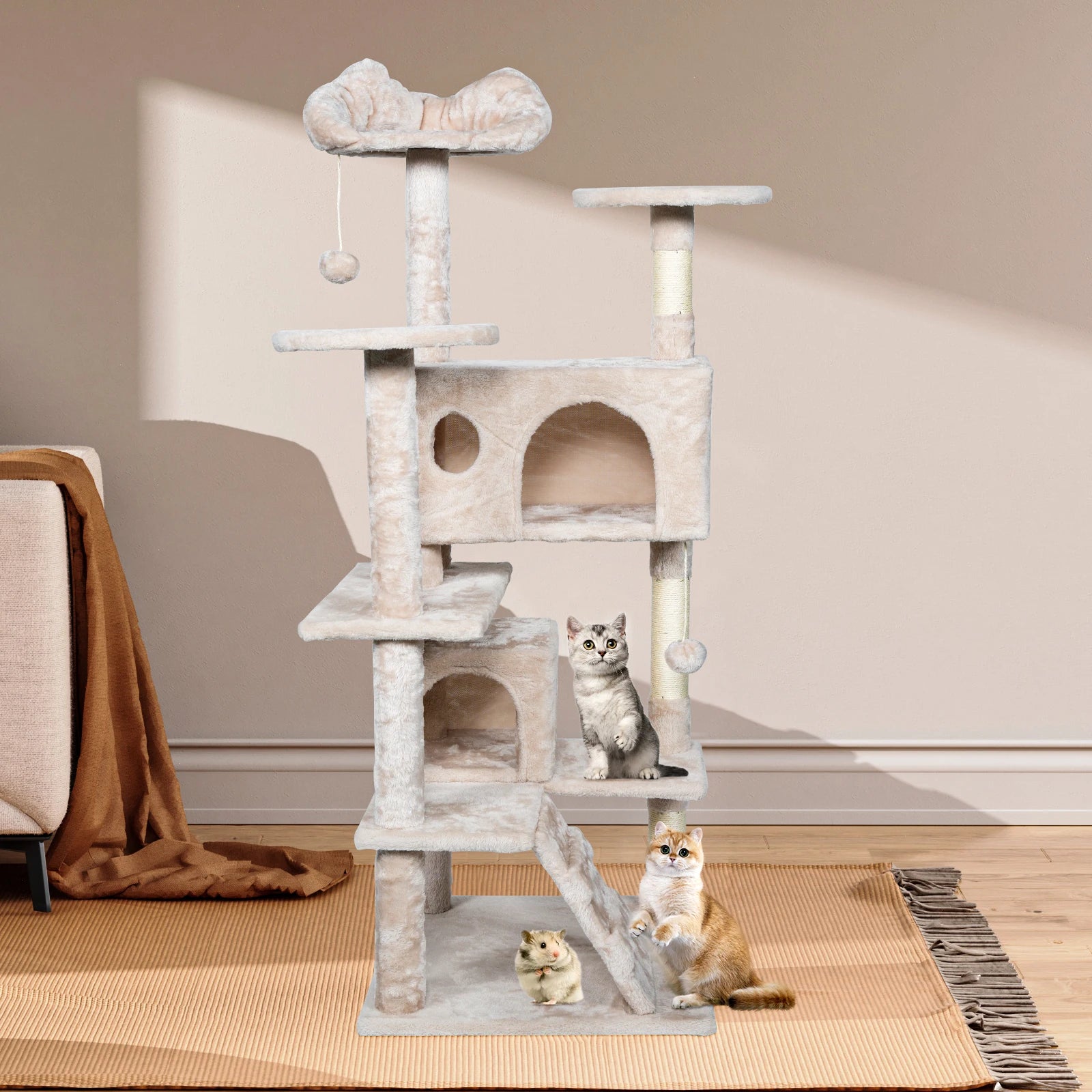 This cat climbing frame is a place where your pet cat can play to its heart's content, providing hours of fun while keeping your cat energized and healthy. It comes with 1 cat bed, 2 hanging balls, 2 cat holes, 2 platforms and 1 staircase for multiple cats to play and relax. The sisal posts that naturally cover the cat climbing frame allow your cat to sharpen its claws so it doesn't damage your furniture. Cats are very curious creatures and love to observe things, it can be an ideal place for cats to sleep, explore and have fun.