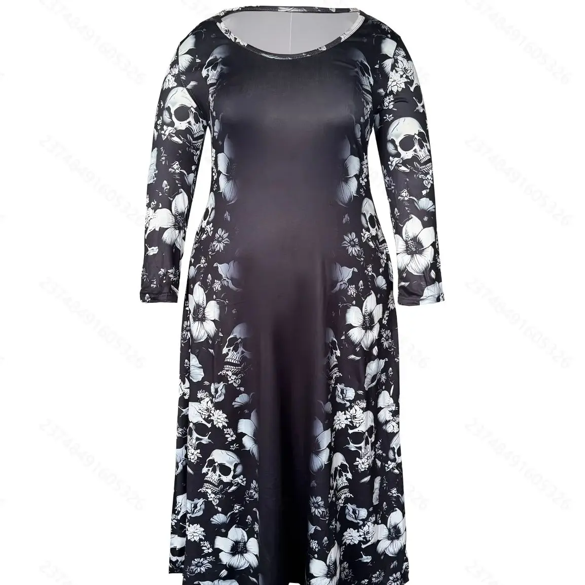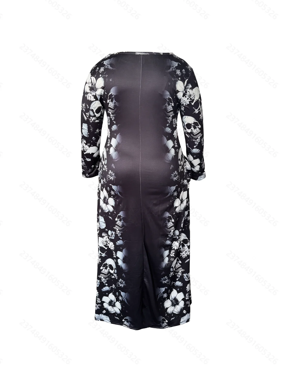 Plus size Maxi dress V neck Color block design Pocket inserted Skull print Dark style Unique pattern