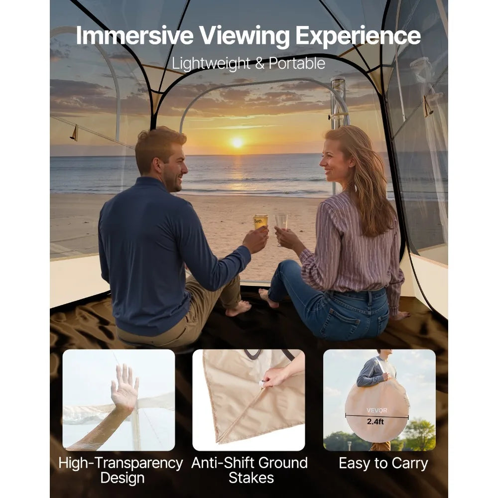 Transparent Pop-Up Design: Effortlessly assemble the pop-up tent within seconds, thanks to its user-friendly design. The clear structure provides a 360° panoramic view, allowing you to fully immerse yourself in the surrounding natural beauty. Please note: This tent is ideal for cooler seasons like autumn and winter and is not recommended for use in hot weather.