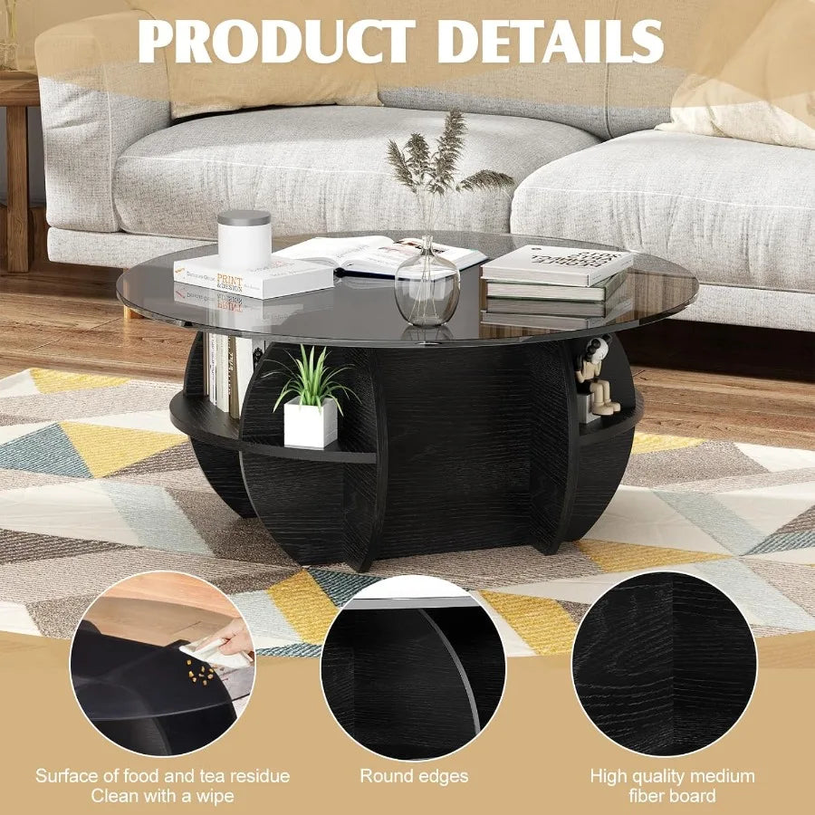 Round Coffee Table Modern Coffee Table Glass Top with Solid Wood Base Large Rustic Circle Center Cocktail Table Unique Accent G