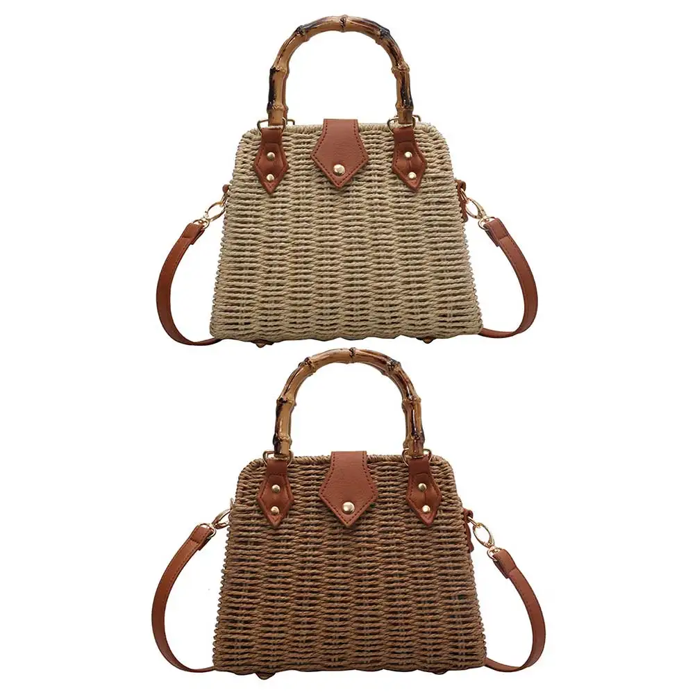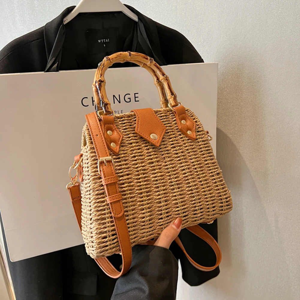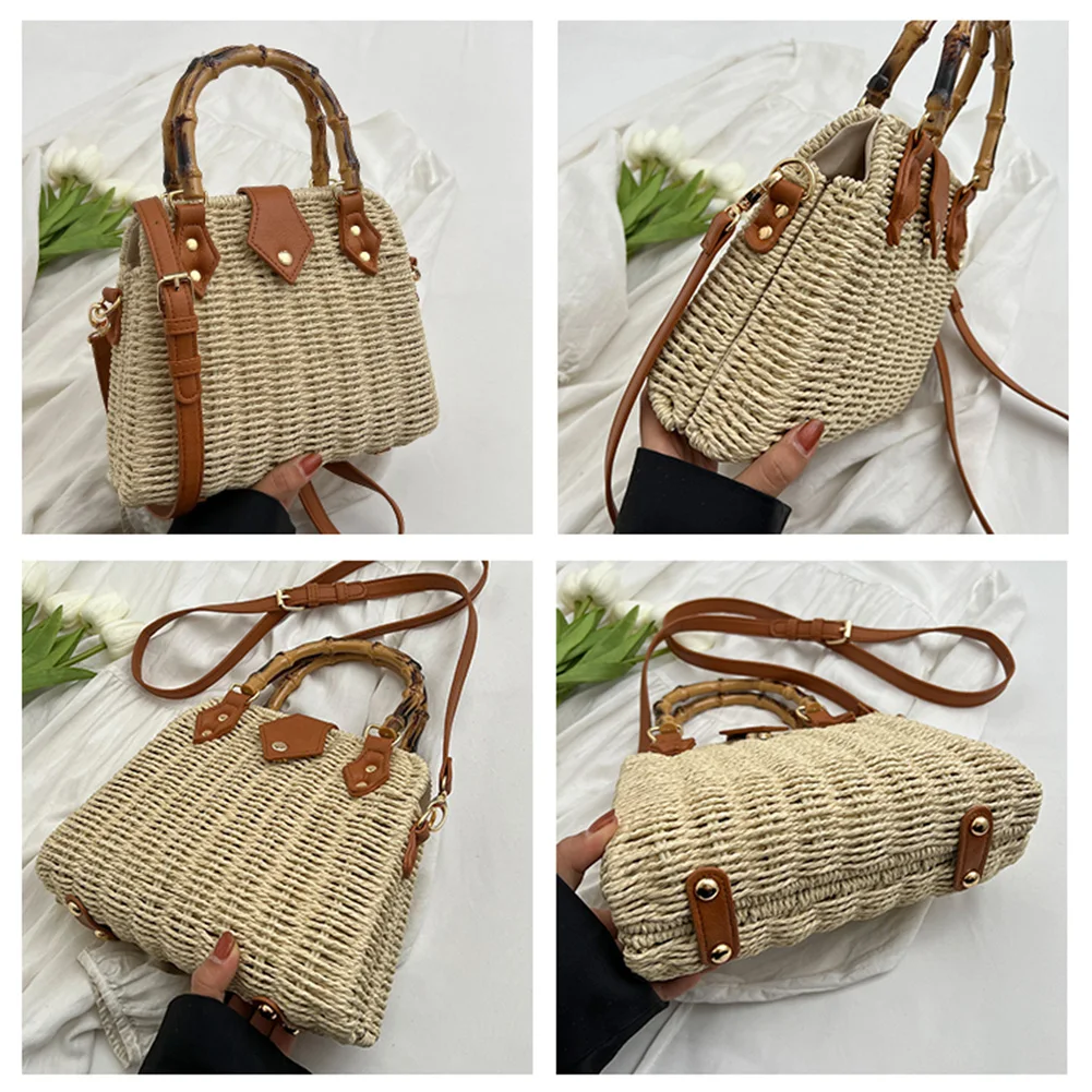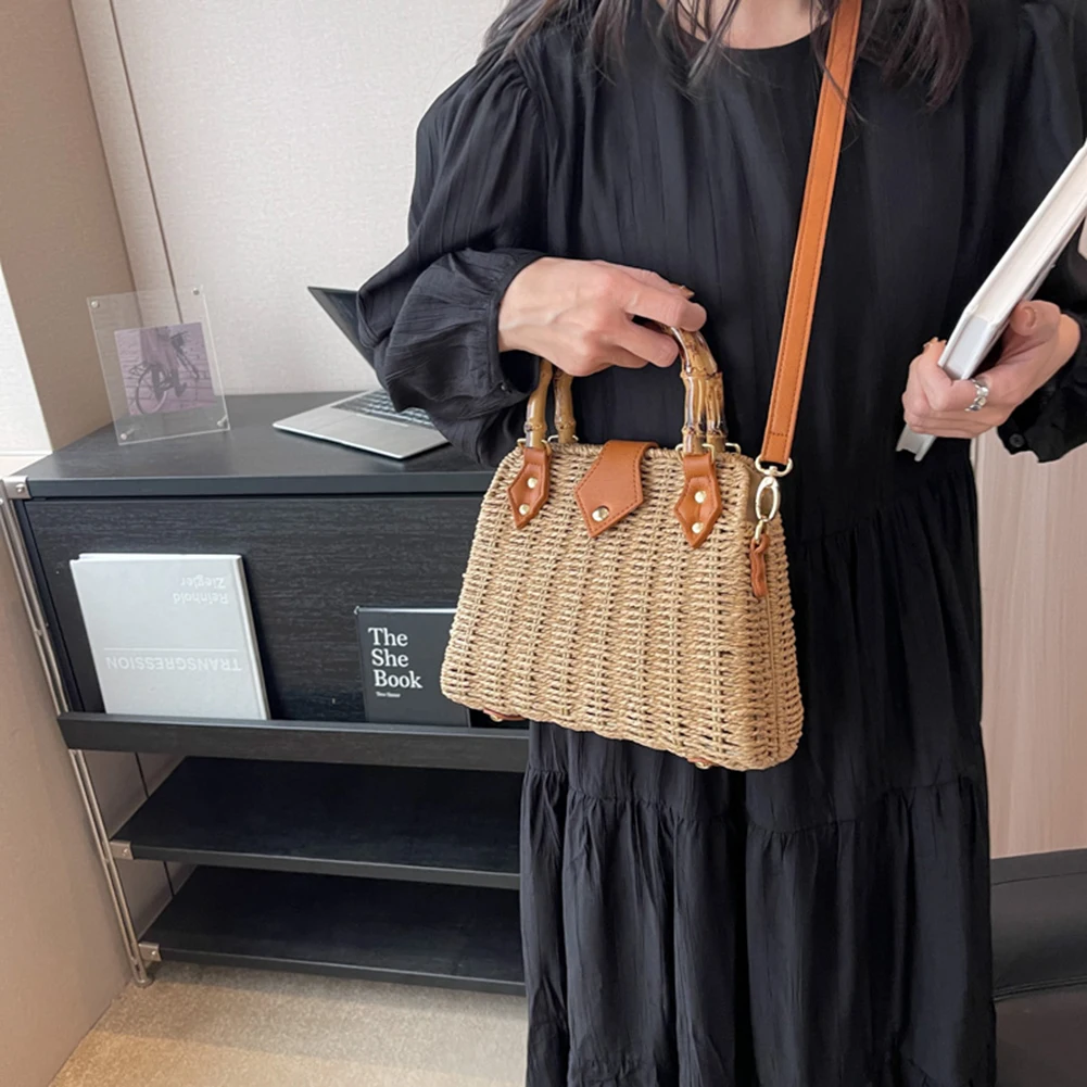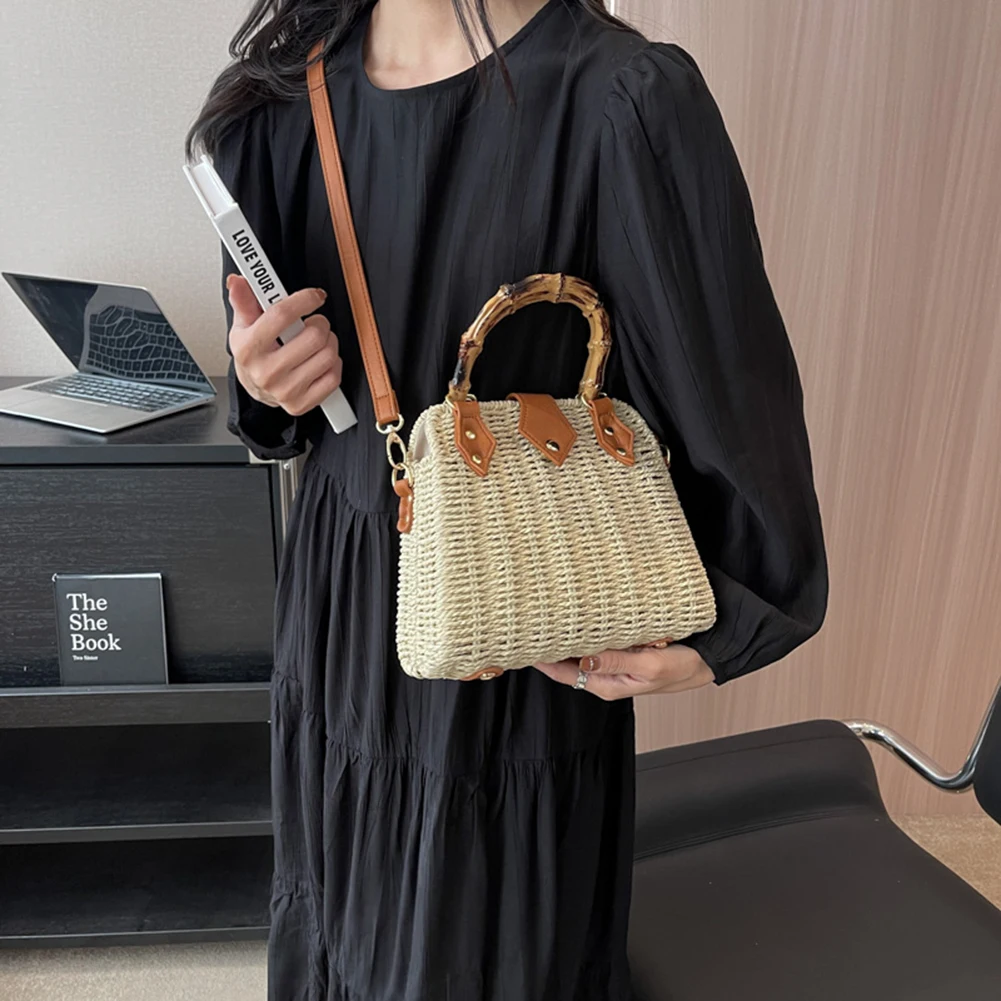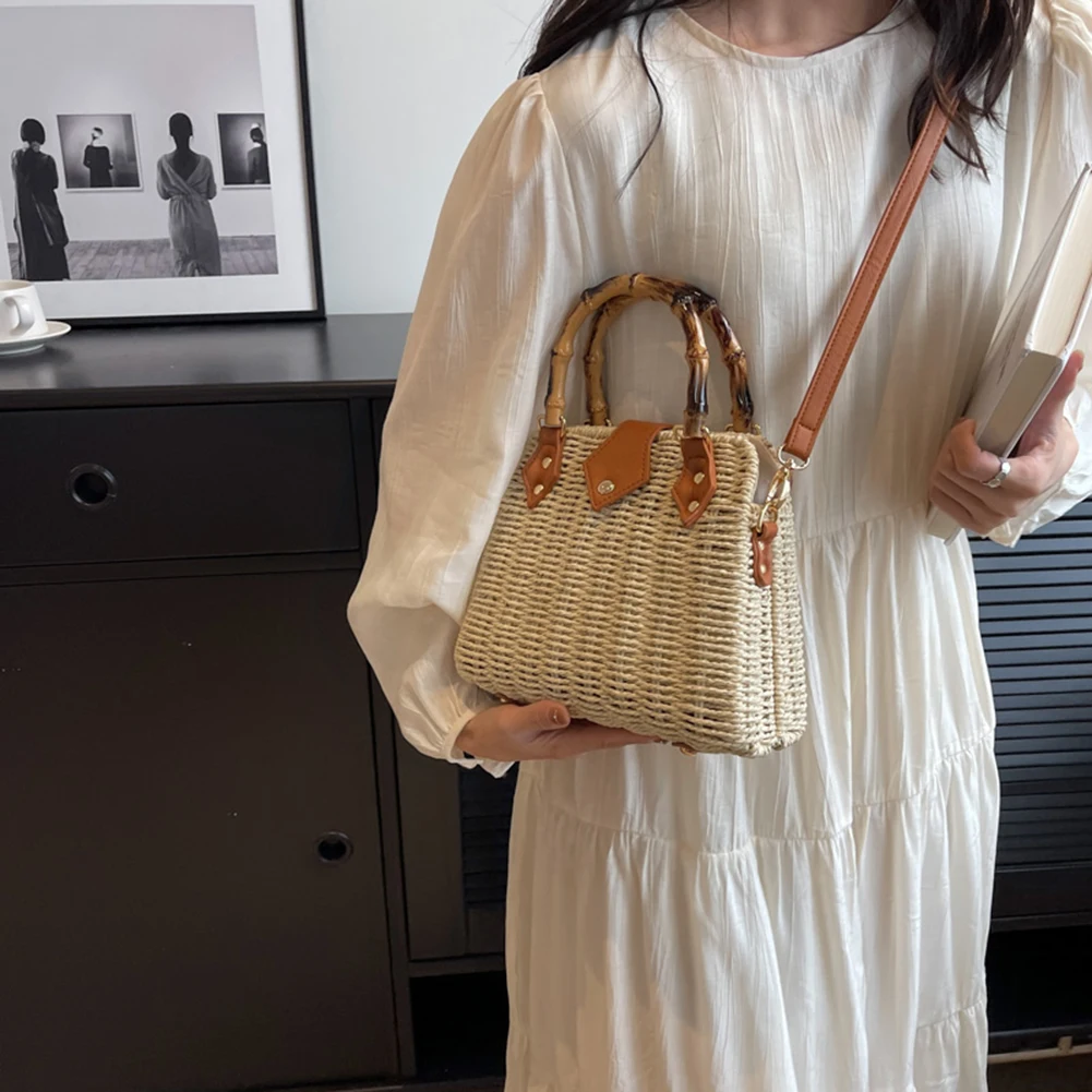 Summer Hand-Woven Handbags Bamboo Handle Woven Beach Crossbody Bag Handmade Simple Portable Adjustable Strap for Seaside Holiday
