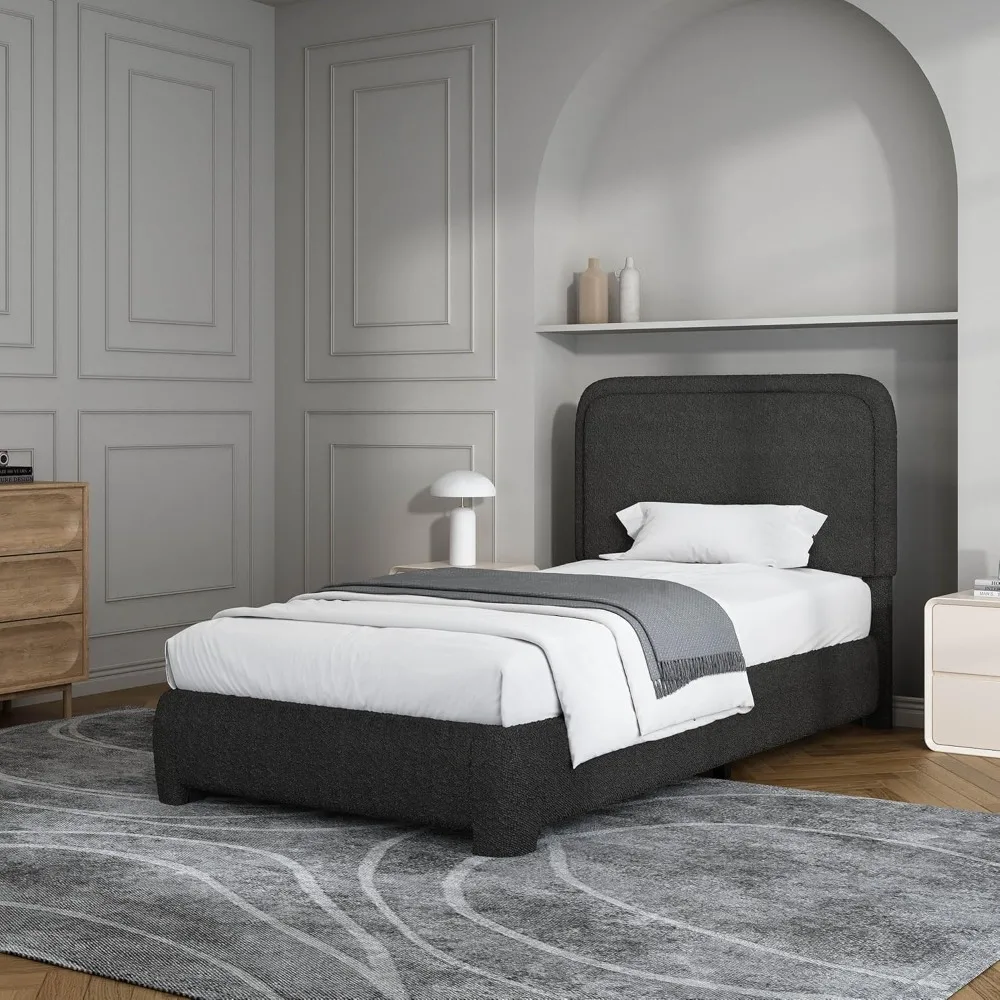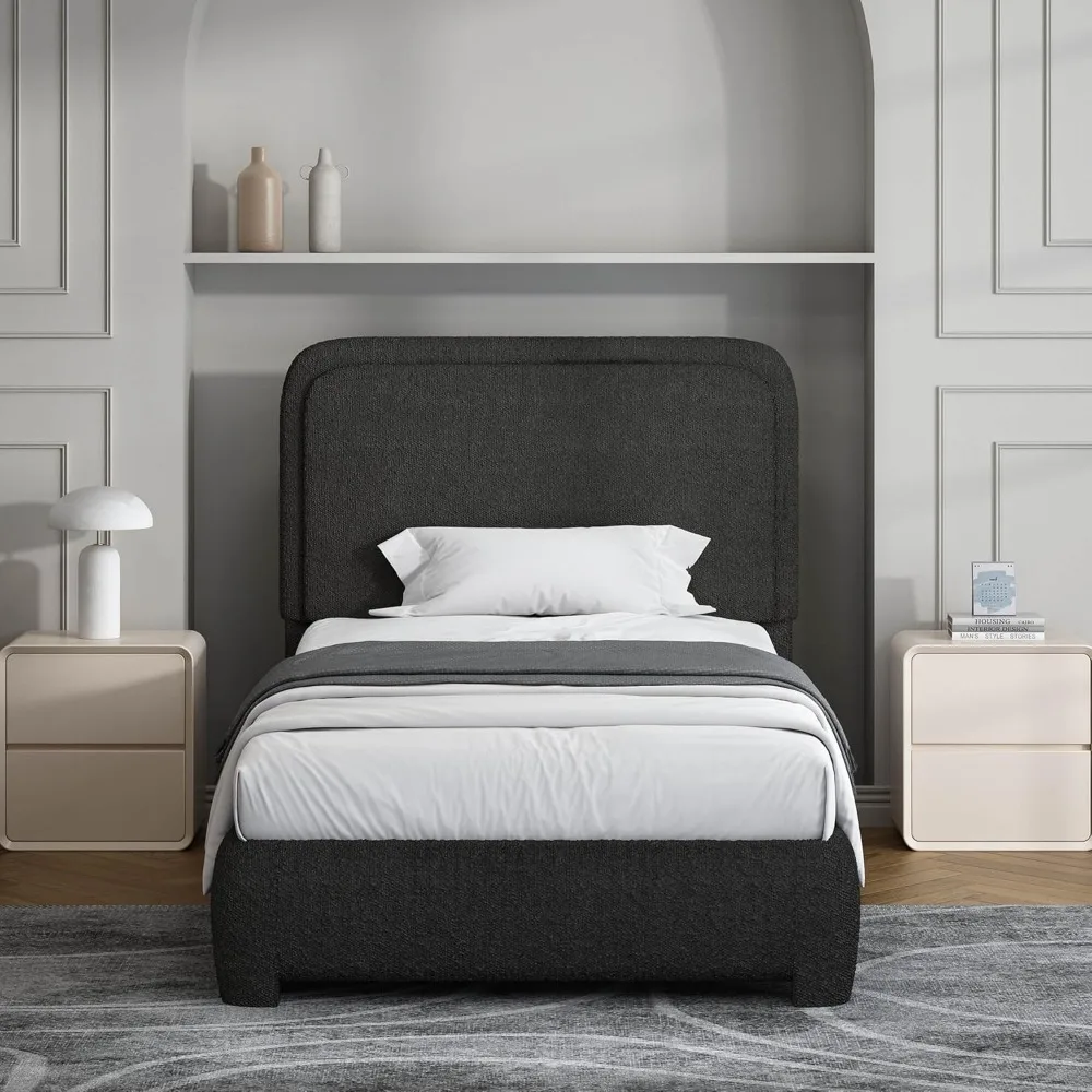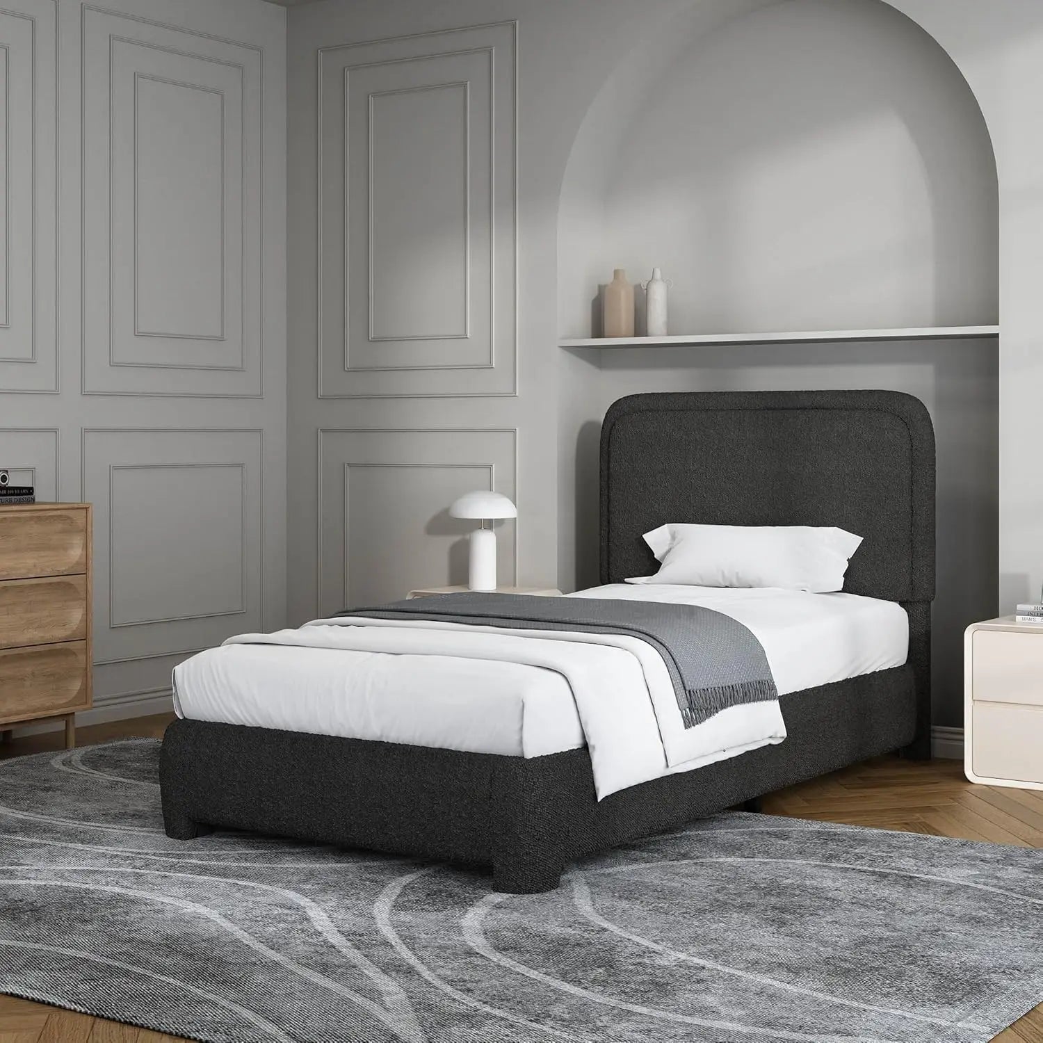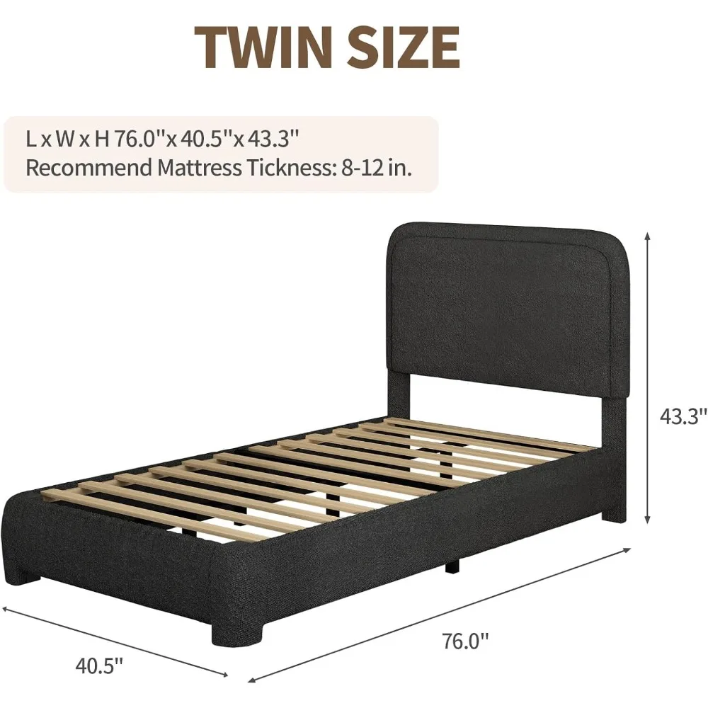 Twin Size Bed Frame, Boucle Upholstered Platform Bed with Headboard, Modern Style, Soft Rounded Corners, No Box Spring Required,