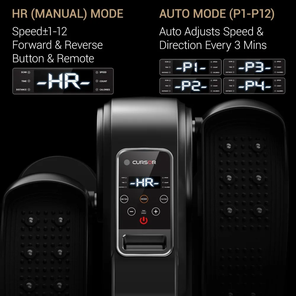 - 12 Speeds & 12 Modes: CURSOR Fitness elliptical training machine features 12 level speeds and 12 workout modes, providing diverse possibilities to elevate your exercise routine. Whether you are doing rehabilitation exercises or strengthen leg muscles and relax foot joints, choose the different speed and mode you want. You can use under desk elliptical while watching TV, reading newspapers or working