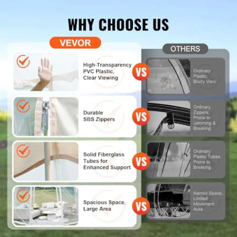Large Bubble Tent 10 x 9.2 ft w/ Clear, Waterproof & Cold-Resistant Feature: Our bubble tent is made with cold-resistant PVC plastic, designed to keep you cozy while providing a crystal-clear view. Thanks to its tear-proof material and heat-sealed seams, no need to worry about leaks—even in snowy conditions. With a roomy eight-sided design and two windows, you'll have plenty of space to enjoy the outdoors.