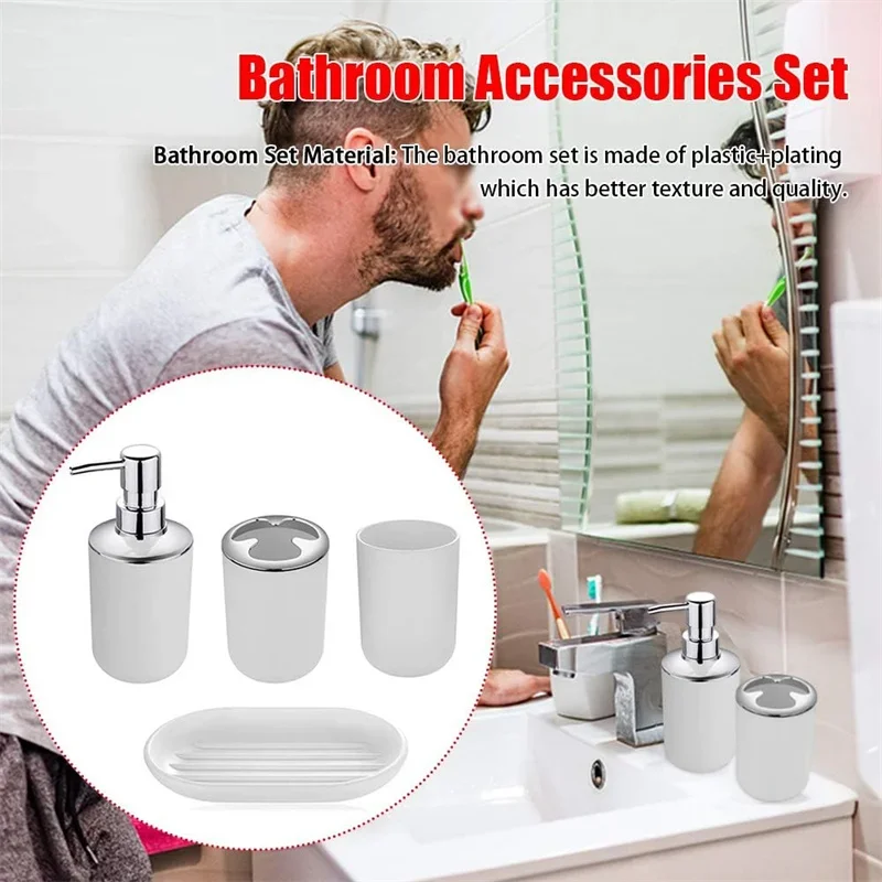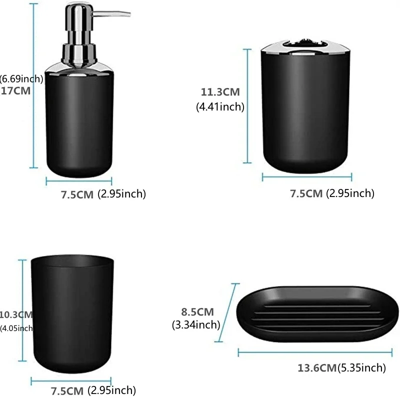 Set A :Toothbrush holder height 11.3cm, diameter 7.5cm, bottle height 17cm, diameter 7.5cm, mouthwash cup height 10.3cm, diameter 7.5cm, soap dish length 13.6cm, width 8.5cm