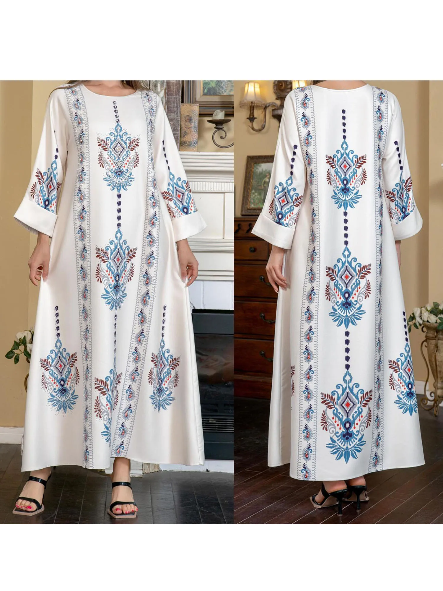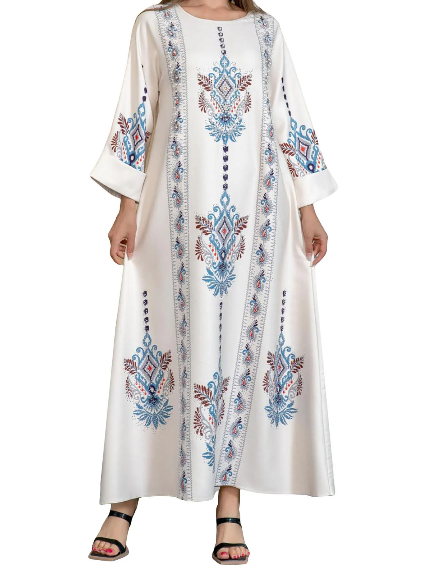 Women's Autumn Long Kaftan Dress Long Sleeve Round Neck Pattern Print Loose Arab DressSize (cm)