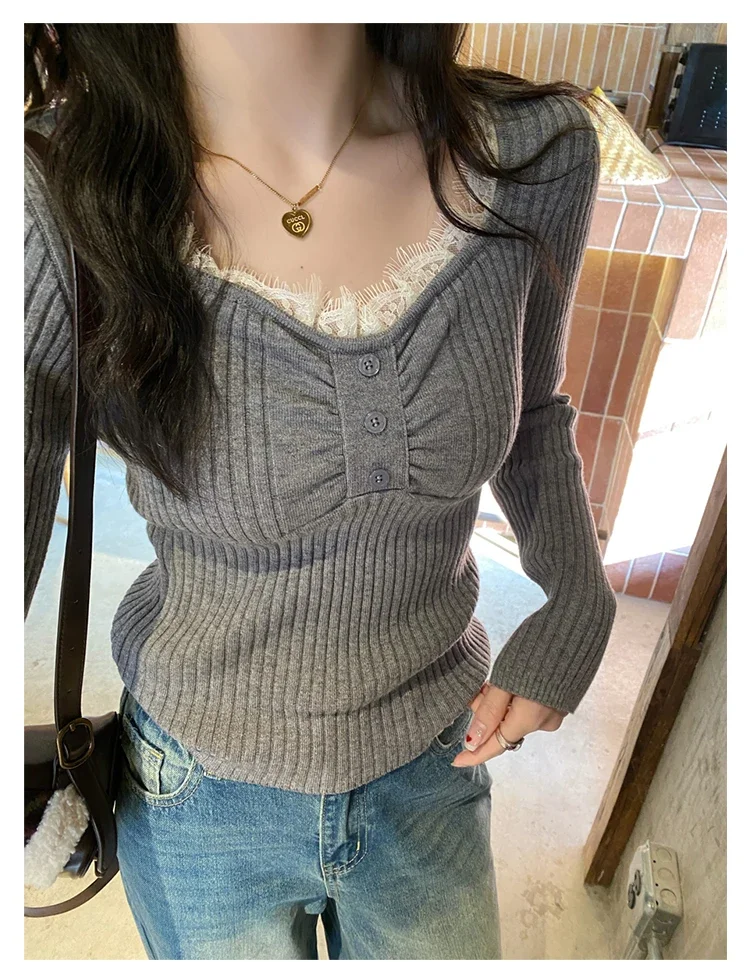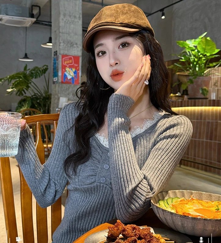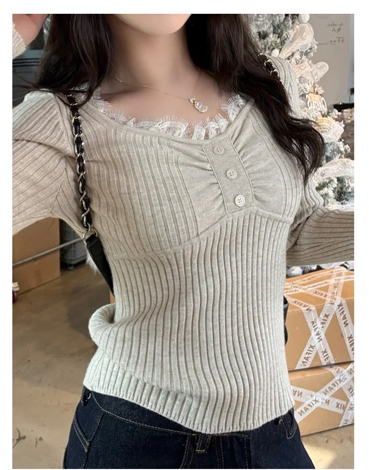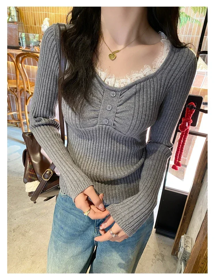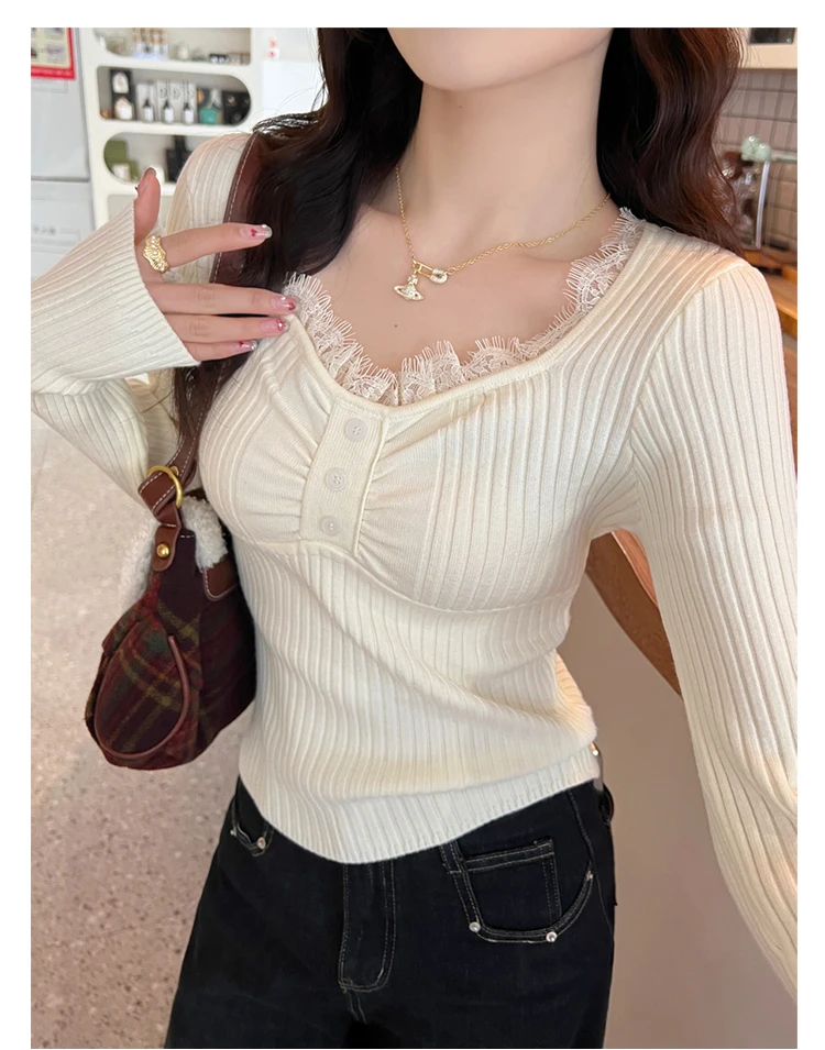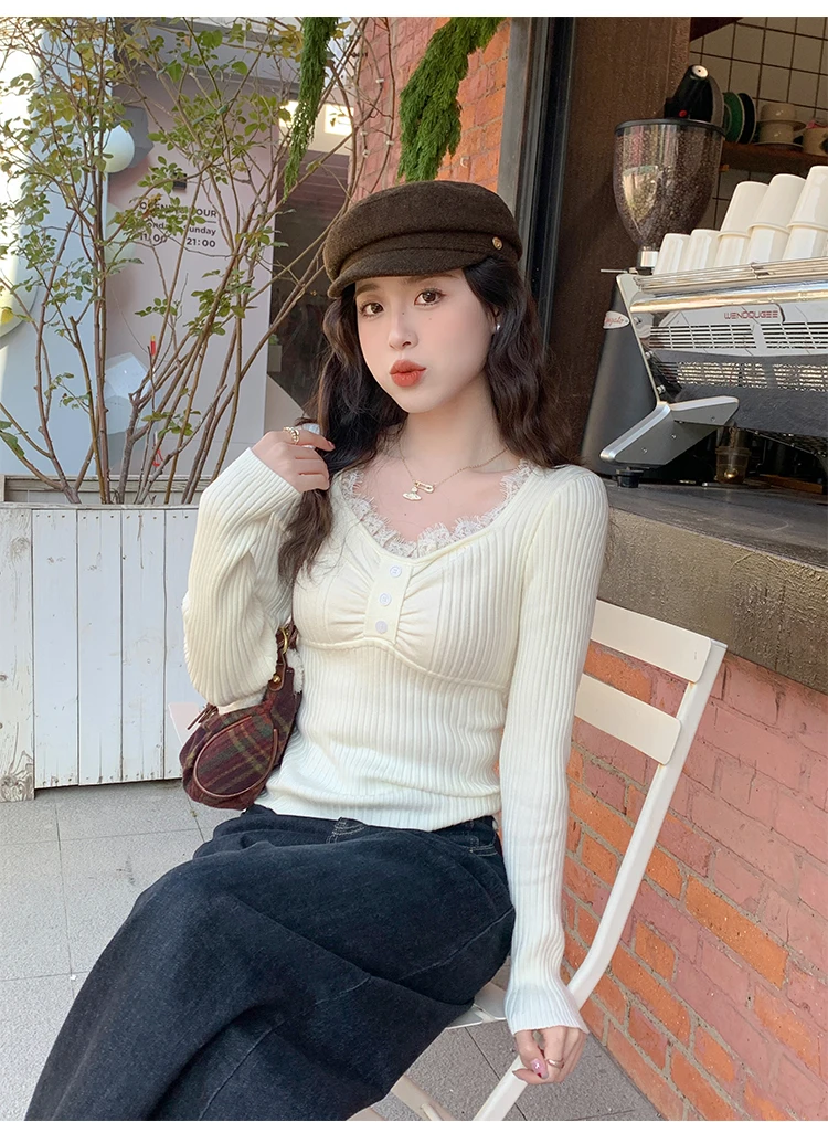 Women's Autumn Winter Simple Base Layer Tops New Low-Neck Lace Trim Splice Knitted Pullovers Solid Color V-neck Slim Fit Sweater