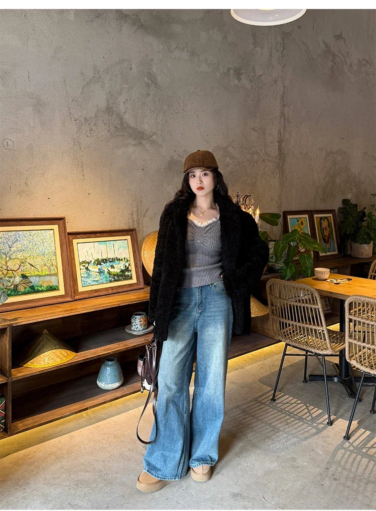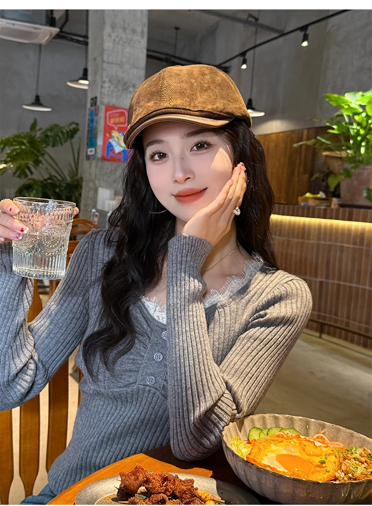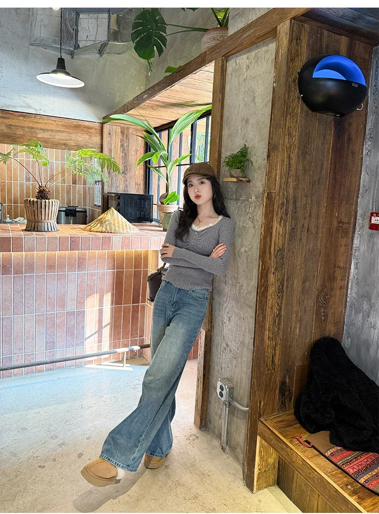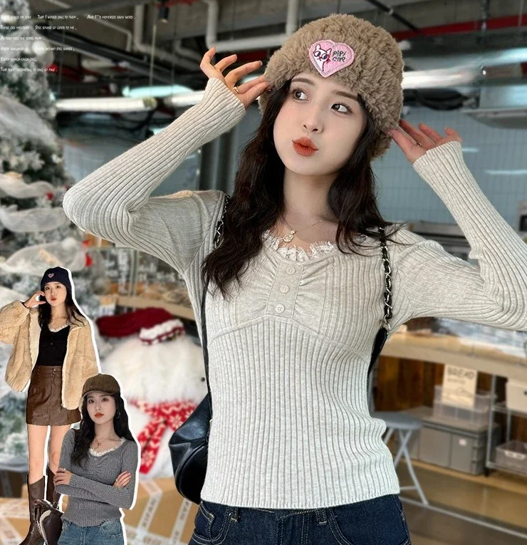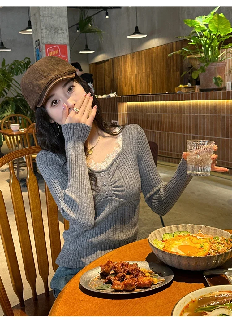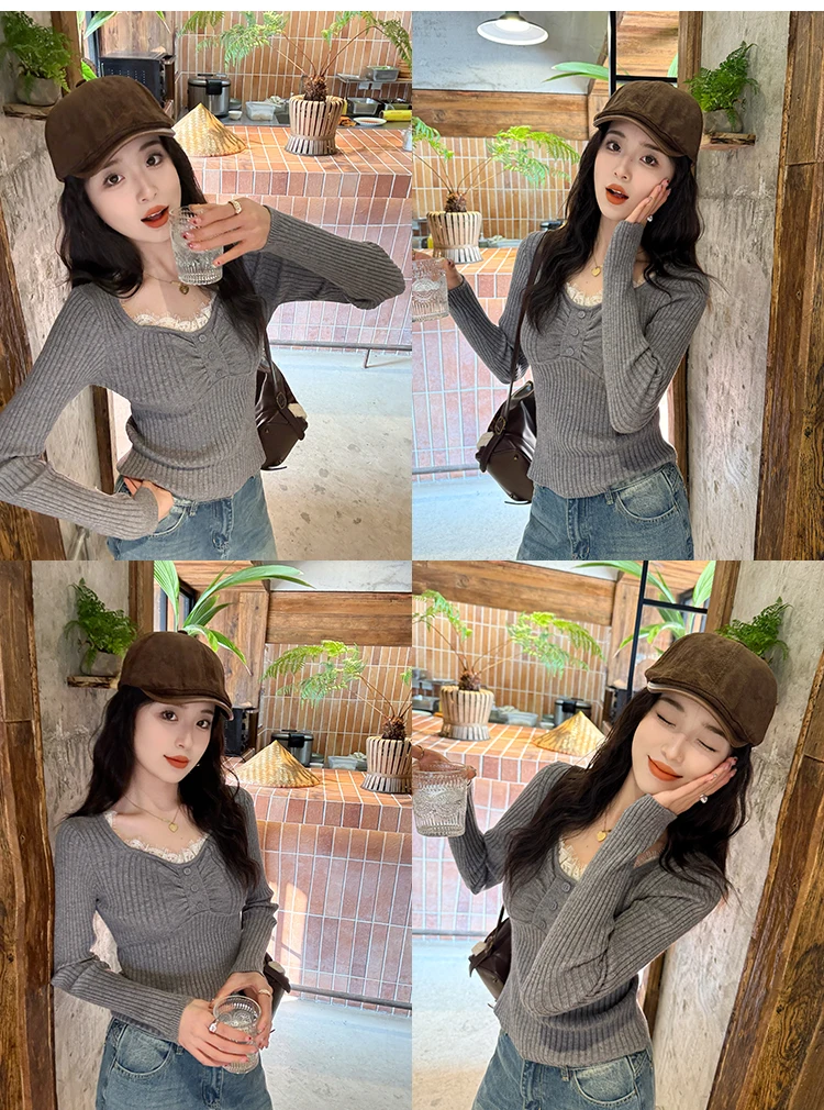 Women's Autumn Winter Simple Base Layer Tops New Low-Neck Lace Trim Splice Knitted Pullovers Solid Color V-neck Slim Fit Sweater